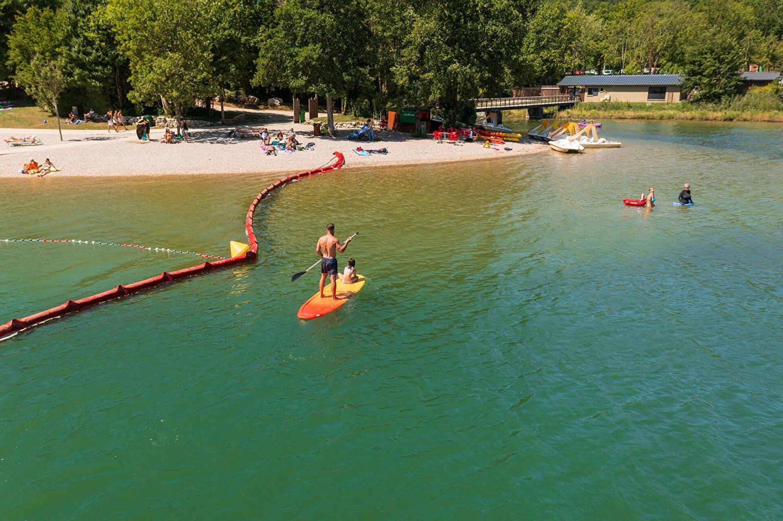 Clear water between the mountains, a 20-hectare surface area, endless activities: paddle, canoe, pedal boat, fishing, boating... its beach for endless swimming (supervised in July and August), water games for the little ones, shaded areas for well-deserved siestas and its "Le Carbet" restaurant and summer concert evenings.