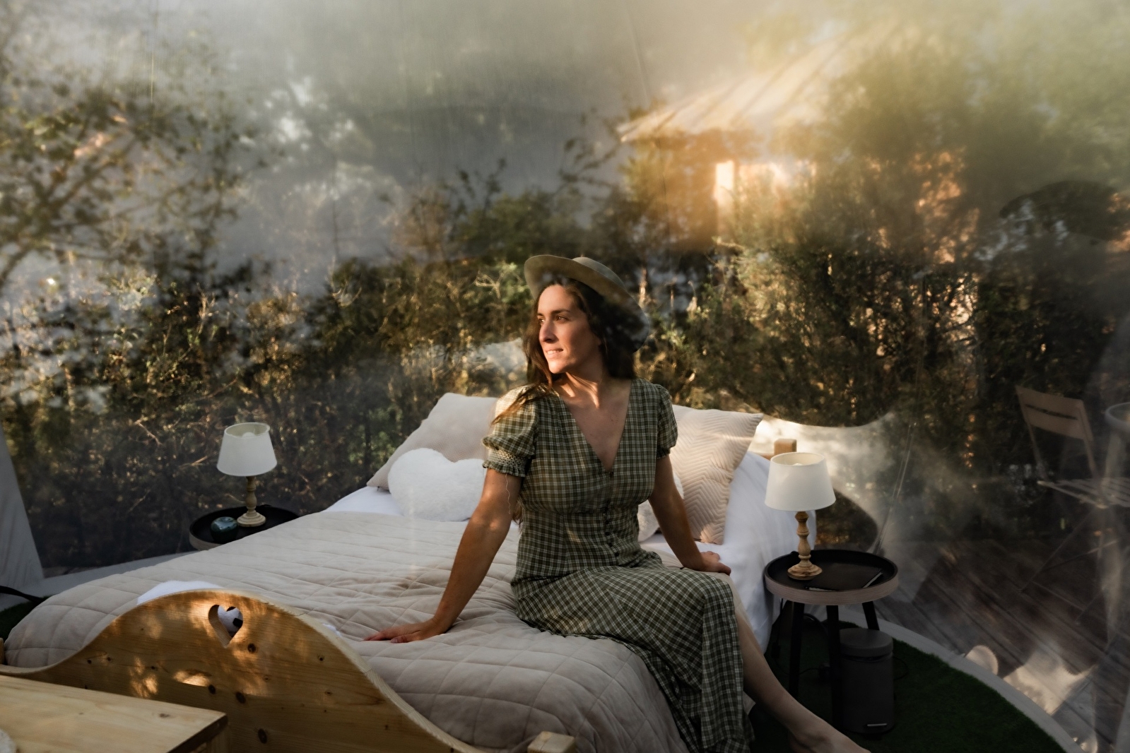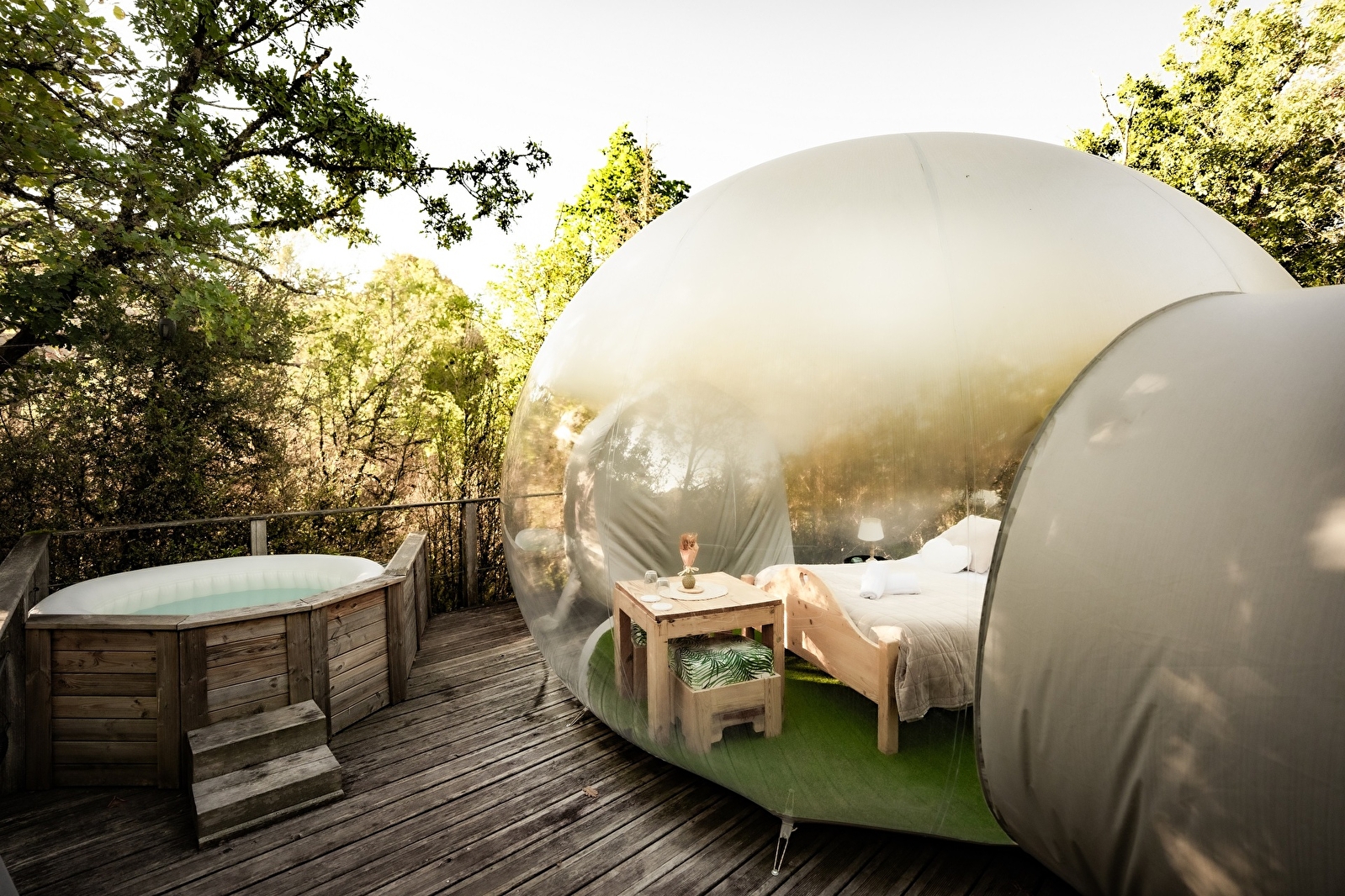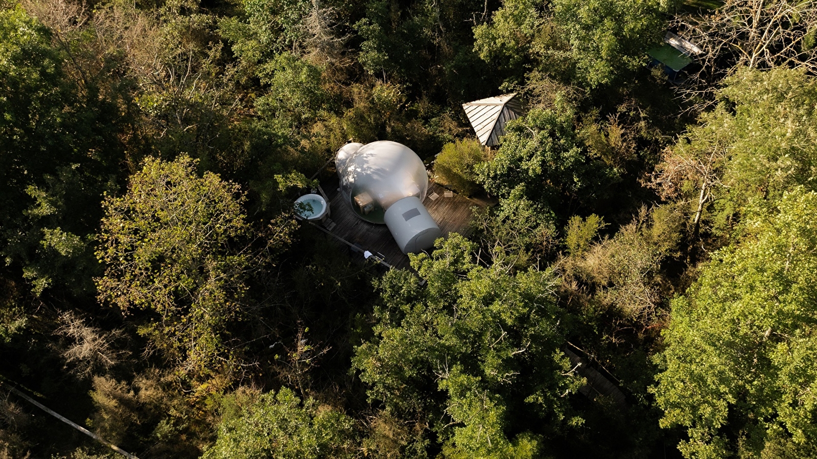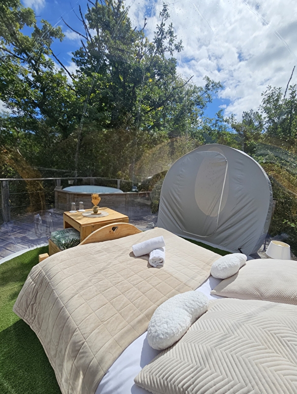 Inflated on a platform immersed in the vegetation of the Géorennes, each bubble offers a fully equipped resting place with table and outdoor living room but also with dry toilets and a private bathroom (sheet, duvet, pillows, towels and gel shower at your disposal).
