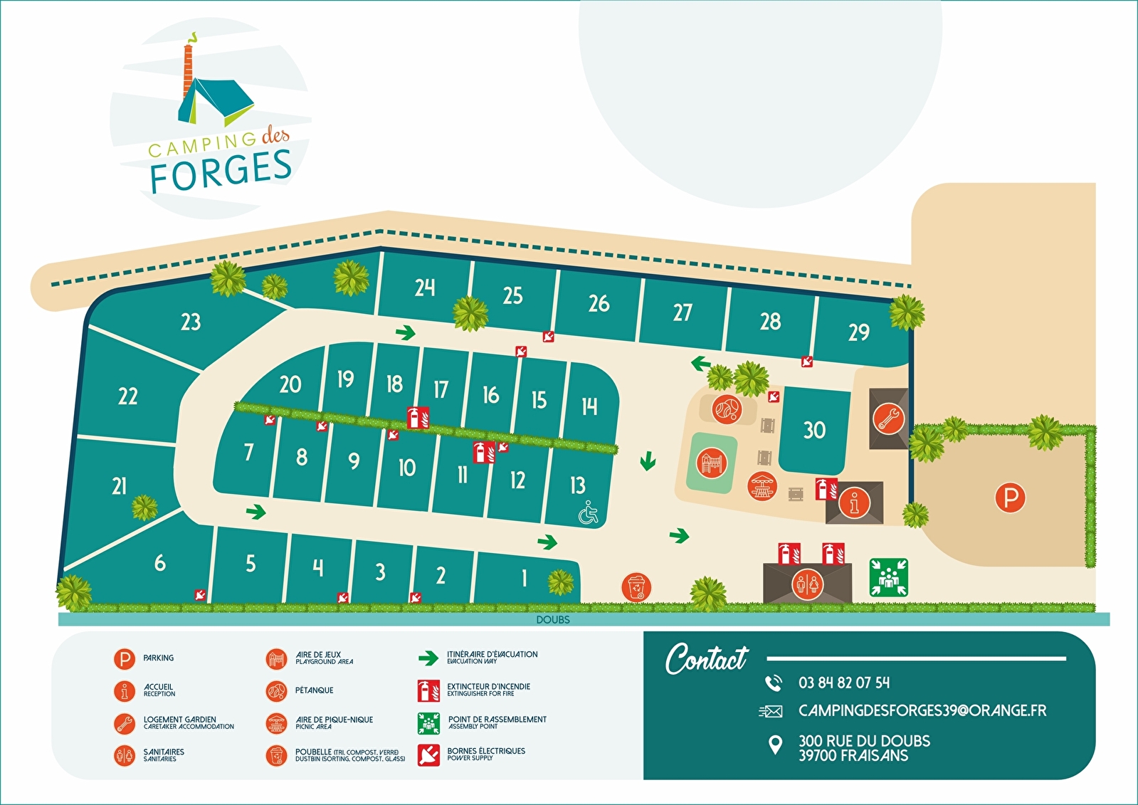 Quiet family campsite with 30 pitches, on the banks of the Doubs and the Chaux forest, between Dole and Besançon, not far from the EuroVélo6. Situated in the centre of the village where you will find a supermarket, a tobacconist's, a chemist's, a garage, a bakery, a pizzeria and many other shops