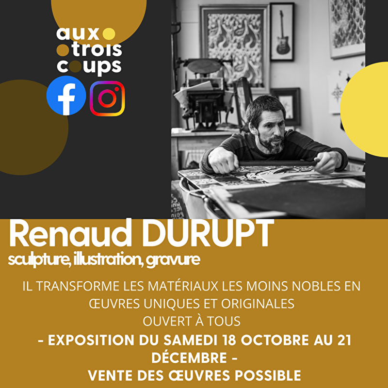Renaud Durupt is a multi-faceted artist whose work spans sculpture, illustration and engraving. His singular approach lies in his ability to transform modest materials, sometimes considered "the least noble", into unique and surprising works.