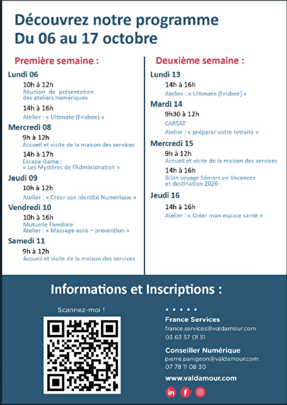 The Maison des Services du Val d'Amour opens its doors to you. Take part in our various events and discover the premises and services available to you. There's something for everyone at the centre: help with administrative formalities, digital learning, the youth sector, childminders and nursery assistants, a variety of workshops and outings!