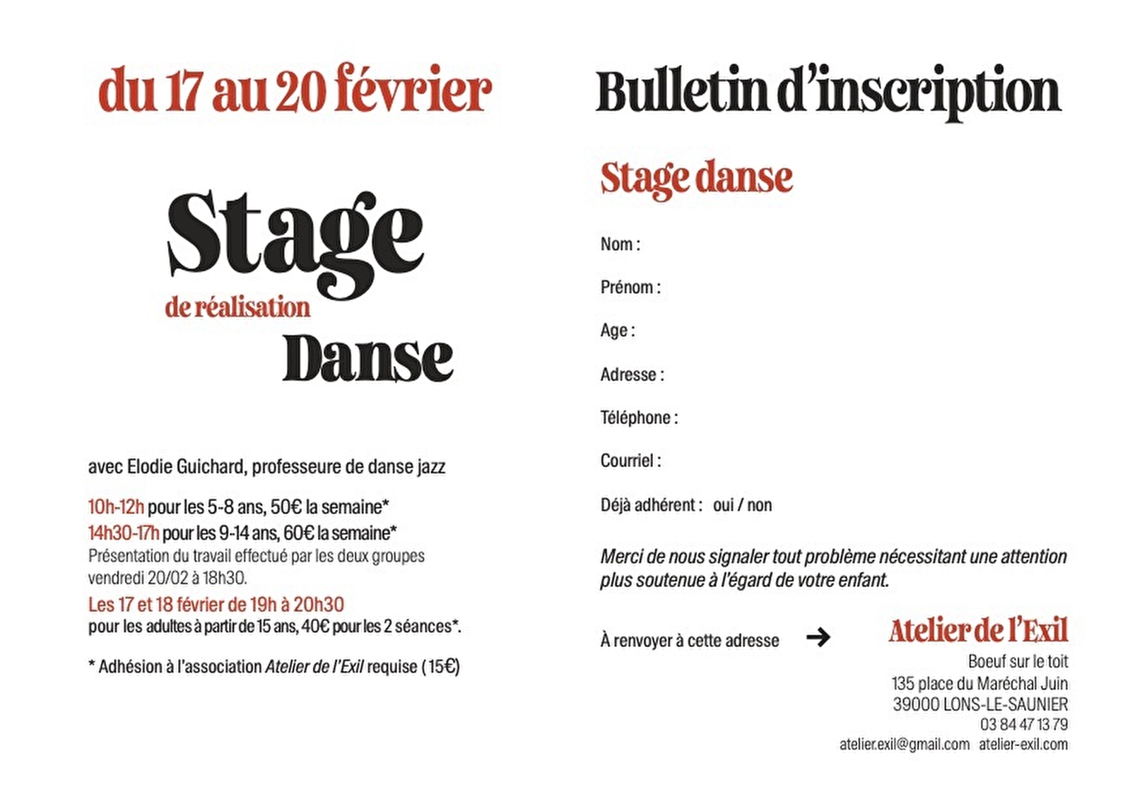 - Base rate (+ 15€ membership to the Atelier de l'Exil) : 95€