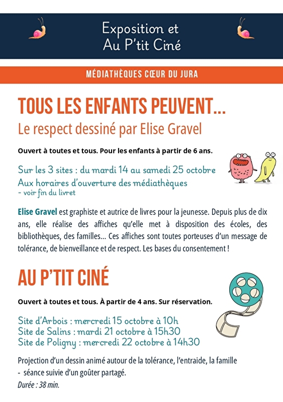 - Screening of a cartoon: Arbois site: Wednesday 15 October at 10am. Salins site: Tuesday 21 October at 3.30pm. Poligny site: Wednesday 22 October at 2.30pm