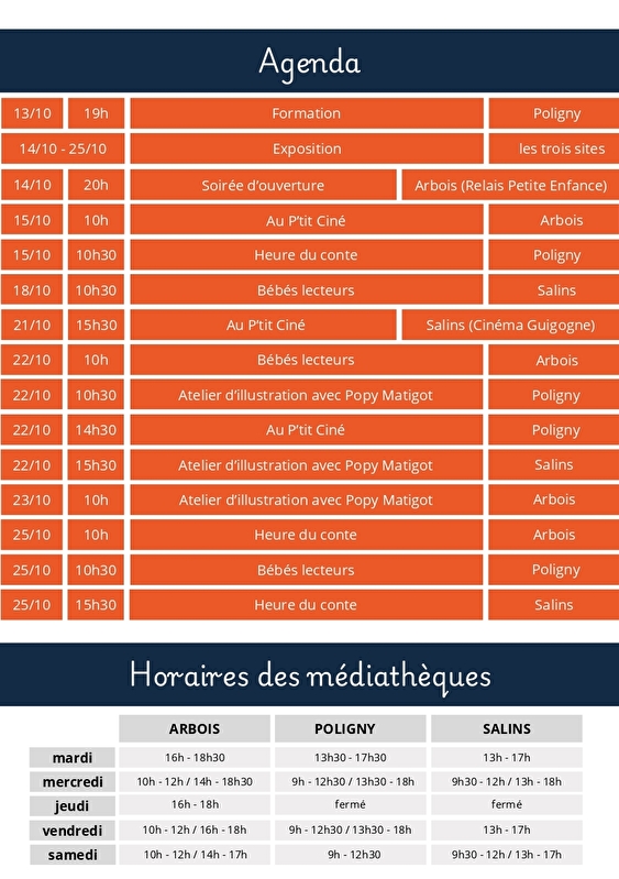 - Story time : Poligny site: Wednesday 15 October at 10.30am. Arbois site: Saturday 25 October at 10am. Salins site: Saturday 25 October at 3.30pm