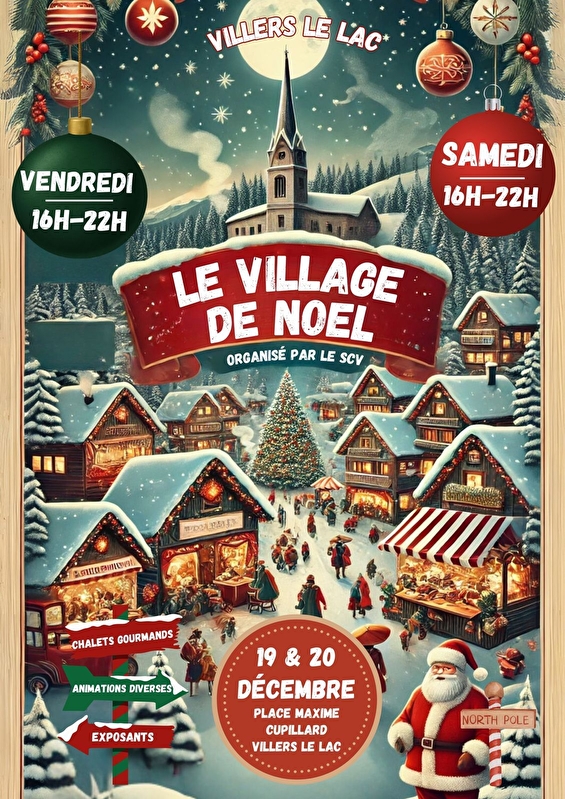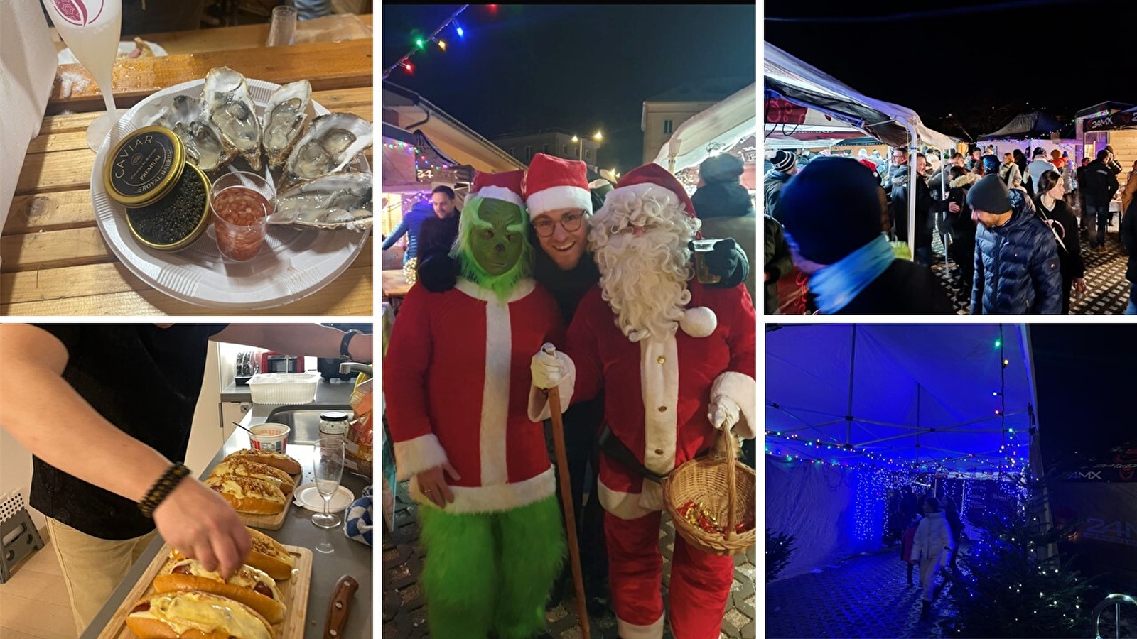 Christmas village with 11 chalets for exhibitors and culinary stands: crêpes, oysters, caviar, foie gras, raclette sandwiches, snails, pea soup. All kinds of drinks: hot chocolate, mulled wine, rum tea, champagne, wine and beer.
