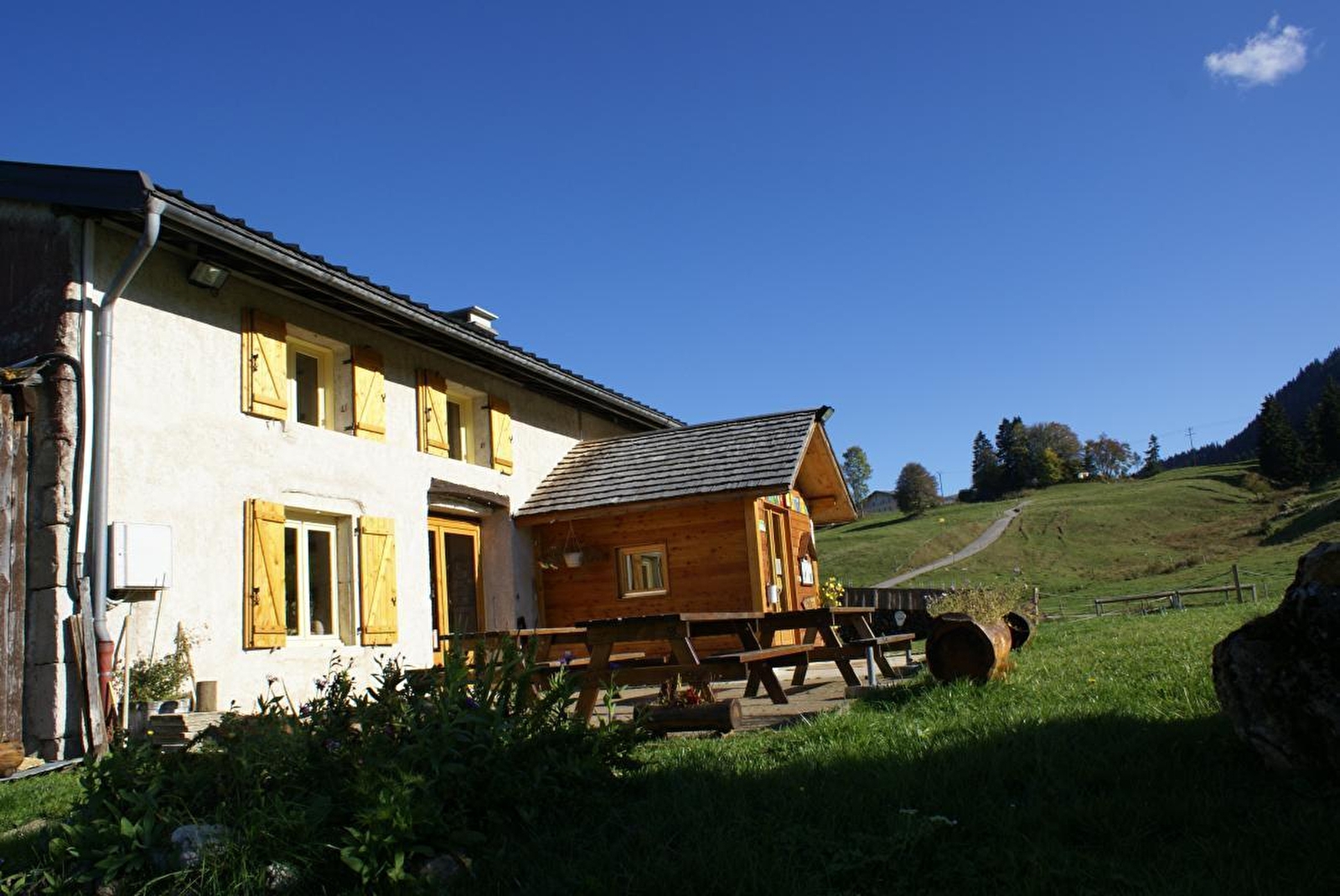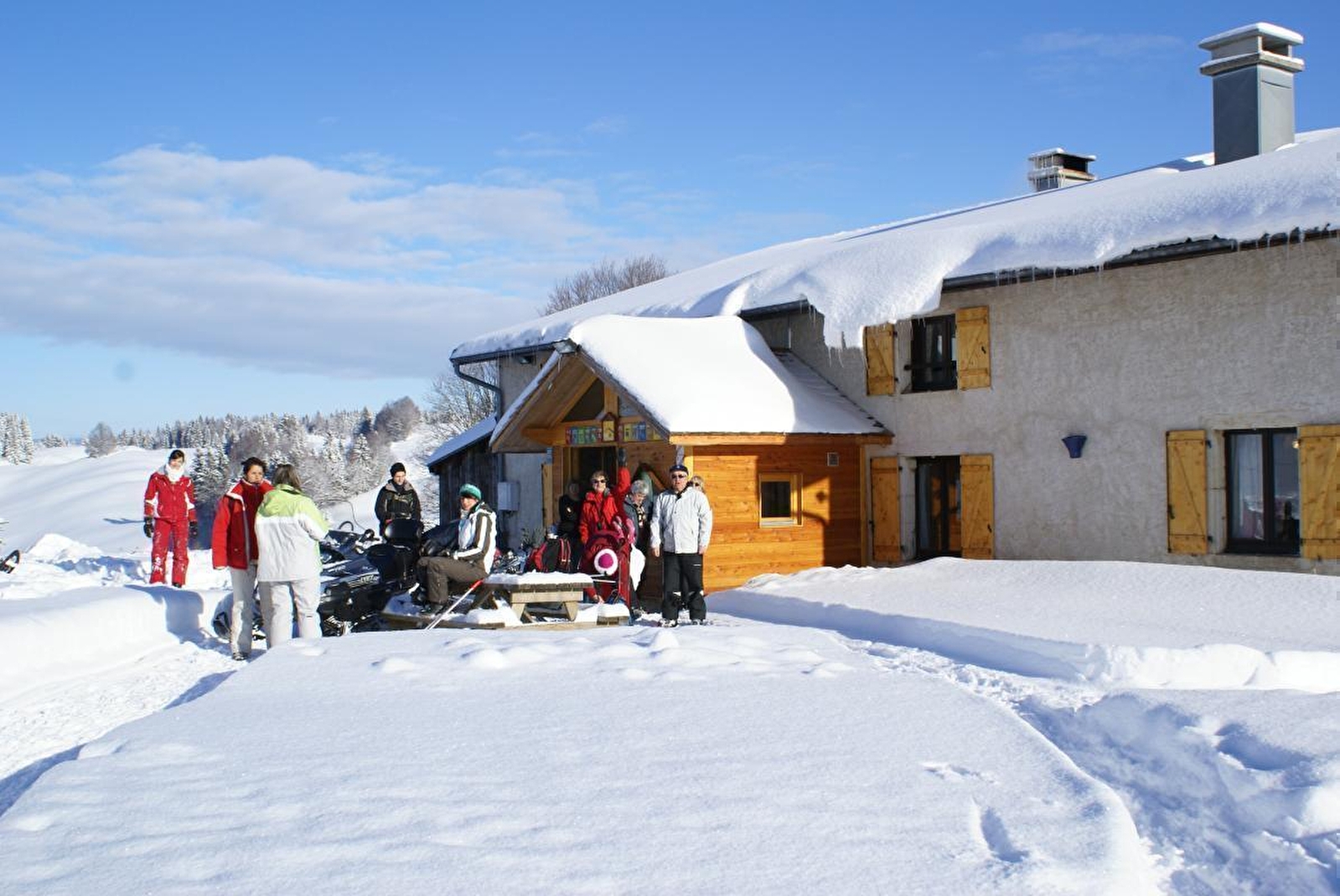A large old farmhouse that has been completely renovated and is set in unspoilt countryside, with 8 bedrooms (2, 3, 4 and 5 beds), 1 dormitory (sleeps 9), 4 showers, 4 WCs, a large communal room with sitting area and fireplace, library, garden, winter car park (400m away). On the GTJ cross-country skiing, snowshoeing and GTJ equestrian trails. GTJ mountain biking nearby, numerous mountain bike trails, GR5, GR9. Maps and guides available from the gîte. Ice rink and national cross-country skiing school at Prémanon. Stopover on the Grand Huit, horses welcome in the meadow. Pets welcome in summer only. Reduced rates for groups and children under 10. 3-bed trapper tent, dormitory option (bring your own sheets) or bedroom option (sheets provided). Self-catering gîte rental example from Saturday 2pm to Sunday 2pm €800 excluding bedding and cleaning charge. Pets are accepted, except in winter, no supplement, not in dormitories.