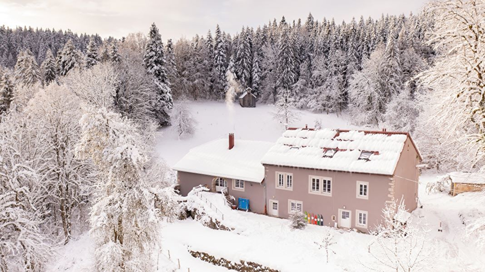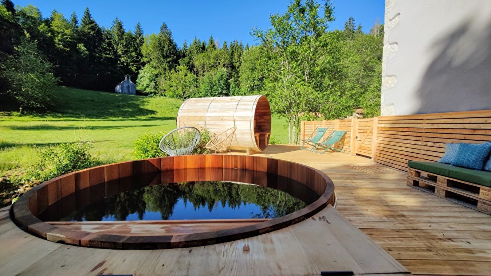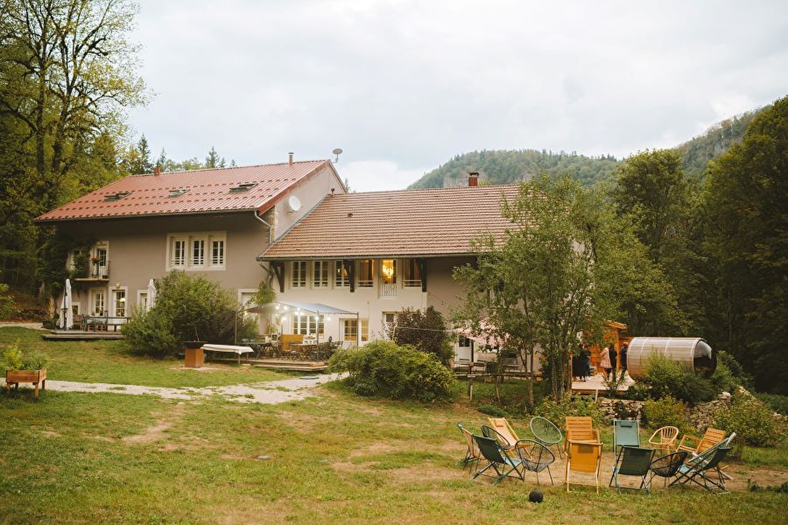 In the heart of the Jura mountains, Domaine le Coupet welcomes you with your family, friends or for a business event for up to 25 people. During your stay, you'll enjoy a huge, comfortable gîte, an outdoor spa (panoramic sauna and Nordic bath) open all year round, high-speed WiFi and amazing outdoor facilities that will delight young and old alike. 8 bedrooms, 7 with en suite facilities (3 double beds (160cm), 22 single beds (90cm)). A large living room with open-plan kitchen, lounges and games room to make the most of your stay. You have the choice of self-catering or boarding, with the option of organising special meals for your group and sporting and creative activities in contact with nature. Just 1h30 from Lyon, Geneva and Lausanne, Le Coupet is a place "into the Wild" where eco-responsibility rhymes with celebration, joy and well-being.