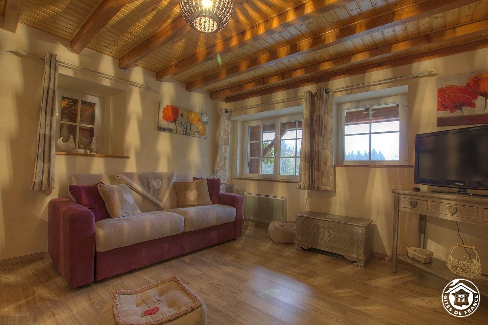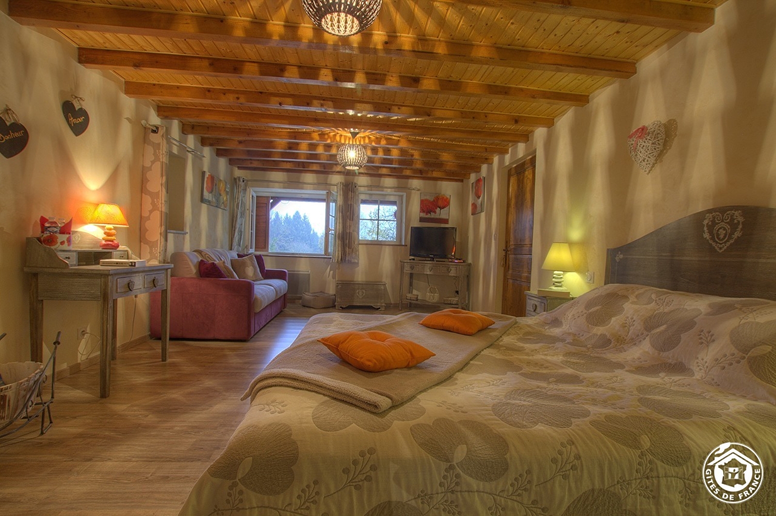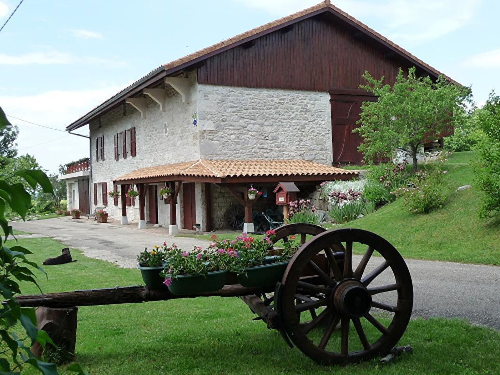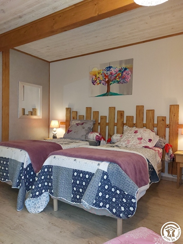 At 750 m altitude, close to the Plateau du Retord, Patricia opens her 5 bedrooms in a quiet, tastefully renovated 19th-century farmhouse. On the first floor, the Romantique room sleeps 4 (1 bed 160x200 and sofa bed 140x190), with private shower room and WC. On the second floor, there are 4 bedrooms: Fidji (2 beds 190x190), Louison (1 bed 160x190 and 1 crib, with the option of a folding bed), Douceur (2 beds 90x200) and Chaleur (1 bed 160x200). Each room has a private, separate shower room and WC. On the ground floor, a kitchen is available to guests. Parking and 3 hectares of grounds. A restful stopover to discover the Plateau du Retord route, an ideal place for hiking, mountain biking, cross-country and downhill skiing and other nature activities. Balneotherapy center 20 km away. Donkey rides at Brénod. Paragliding, accrobranche.