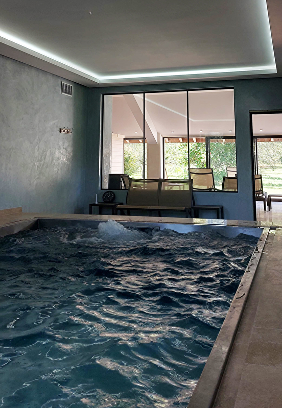 The 100 m² spa includes an indoor pool, a double infra-red cabin, and a 2 m² sensory shower with light therapy, sound and jets of different intensities with rain or torrent effects.