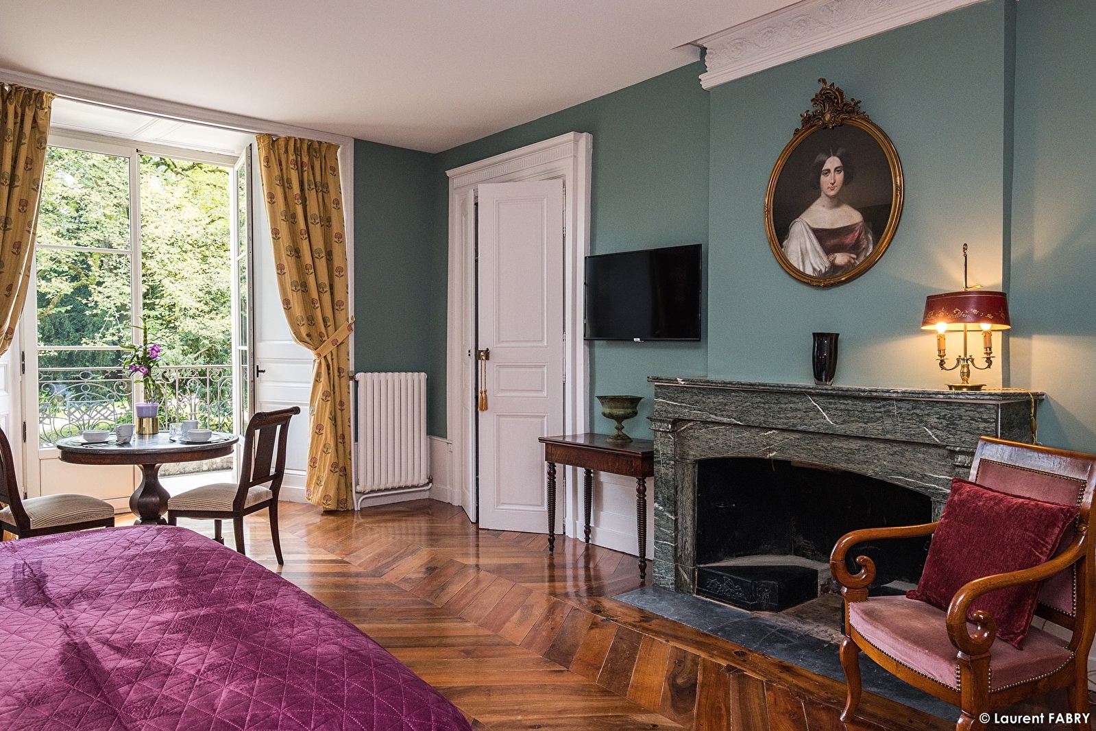 Period furniture, parquet floors, fireplaces, a communal lounge with Louis XV wood panelling opening onto a terrace overlooking the mountains and the park with its two-hundred-year-old trees.