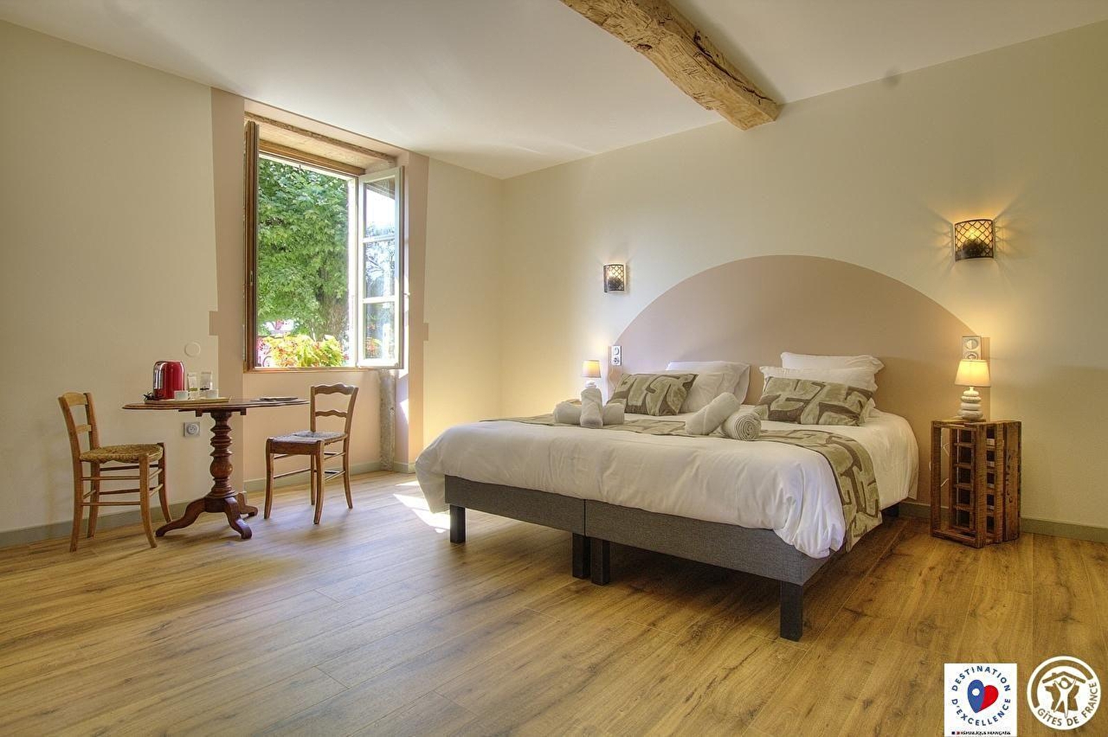 On the ground floor, the Hirondelle room with a view of two majestic plane trees is accessible to people with disabilities. It offers a quiet cocoon where you relax, recharge your batteries and reconnect with nature. Bedding, shower, furniture and toilets are designed to offer complete autonomy.