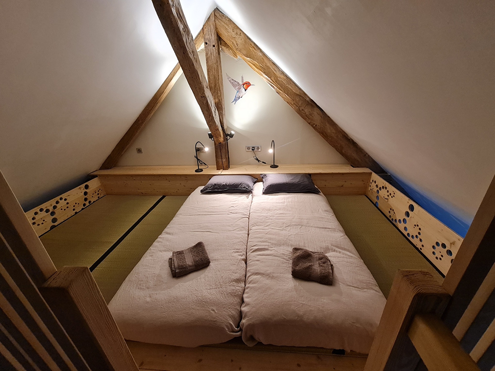 - The Sequoia Room: Located on the top floor of the main house. With its 2 large cathedral windows, it offers a magnificent view to the east over the surrounding mountains. With a surface area of 120m2, it is ideal for yoga, qi gong, singing, painting and other workshops. It is exceptionally bright.