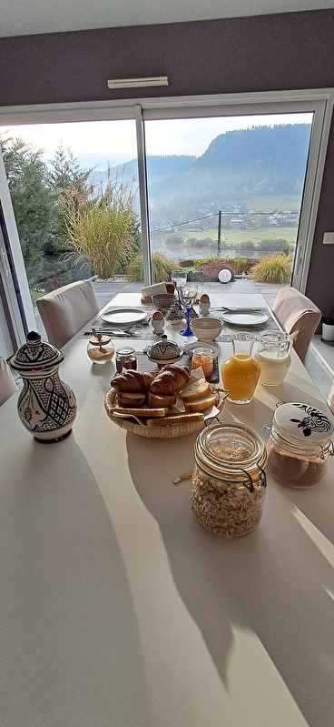 Relax in this calm and elegant accommodation. In its natural setting, surrounded by fir trees and an exceptional view of Lac de Chaillexon, a place where you can relax and unwind in a quiet setting. The comfortable bedroom and bathroom open onto a large south-facing terrace with a magnificent view of the lake.