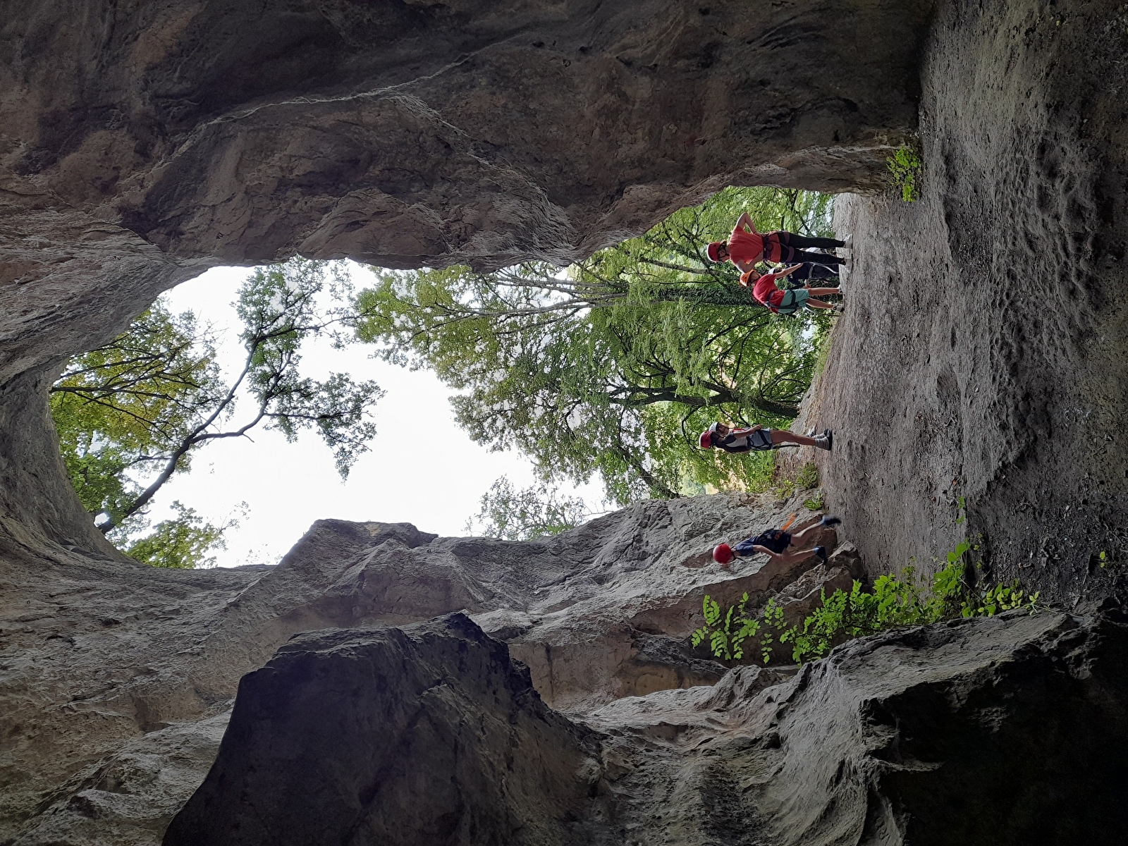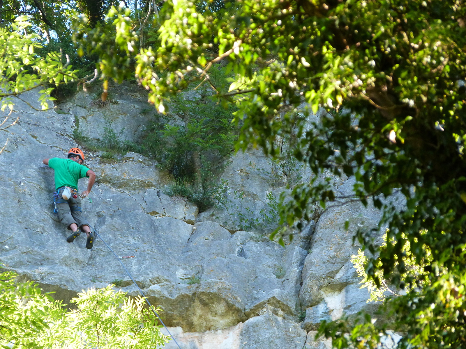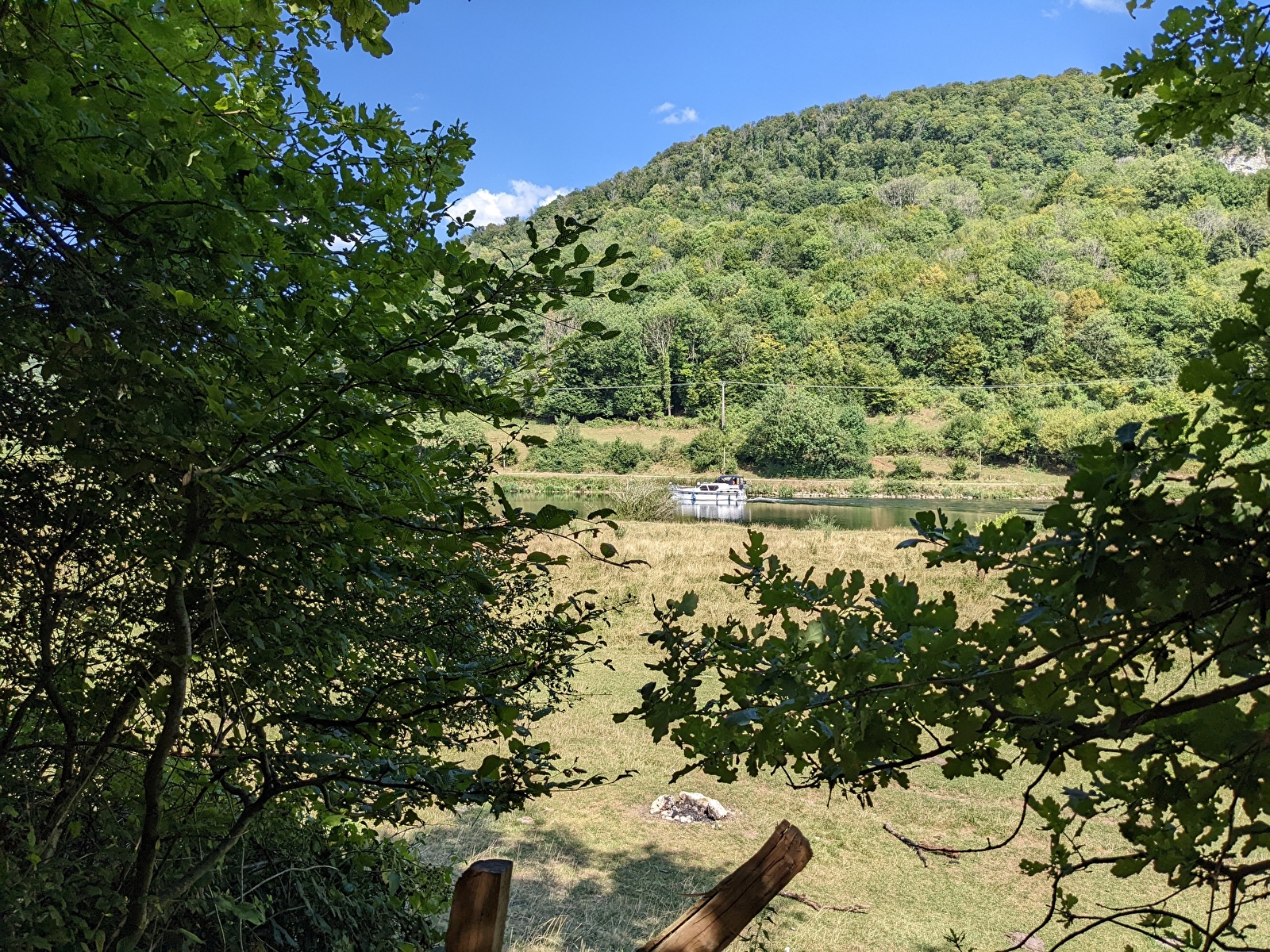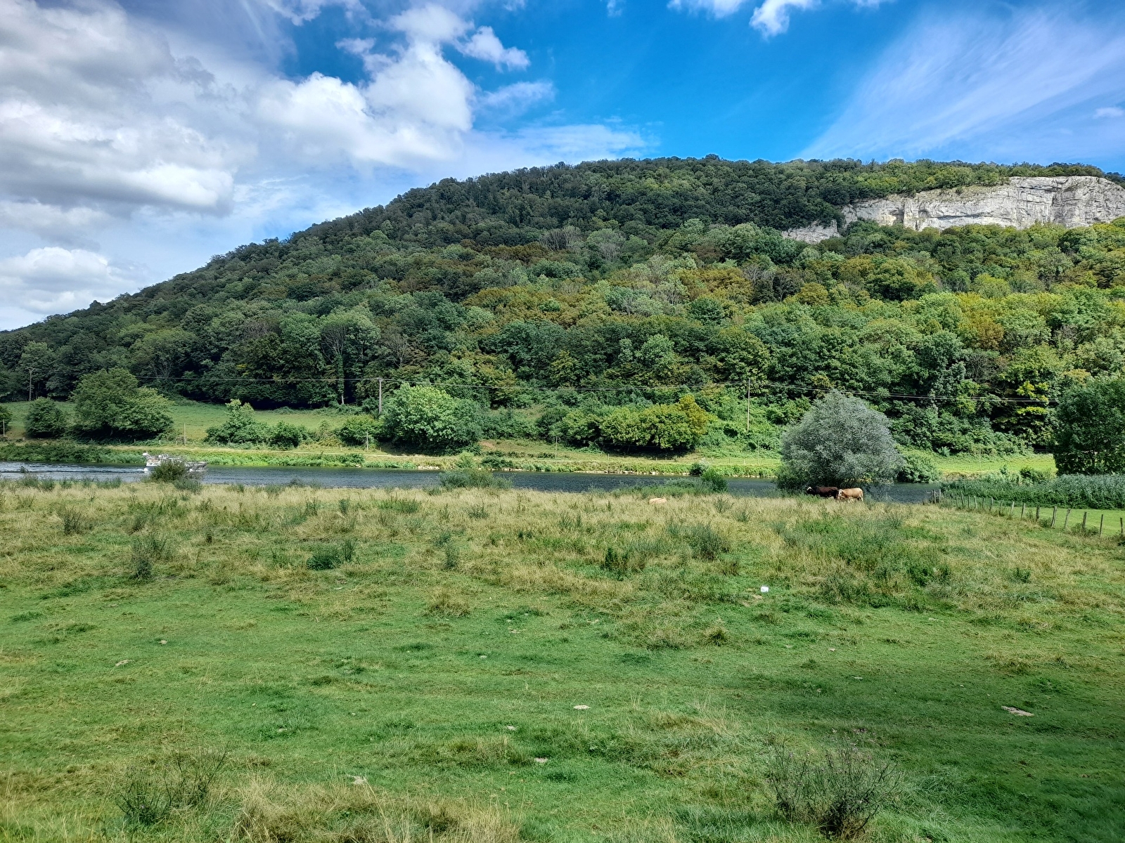 STEP 3 : Enter the pasture at the red turnstile. Cross the pasture, skirting the cliff. On your left, you'll see the Rocher de Sous Buen, a popular climbing spot. You may even discover a small cave at the top of the ladder (your children are your responsibility). Continue along the banks of the Doubs until you reach the D683 road.