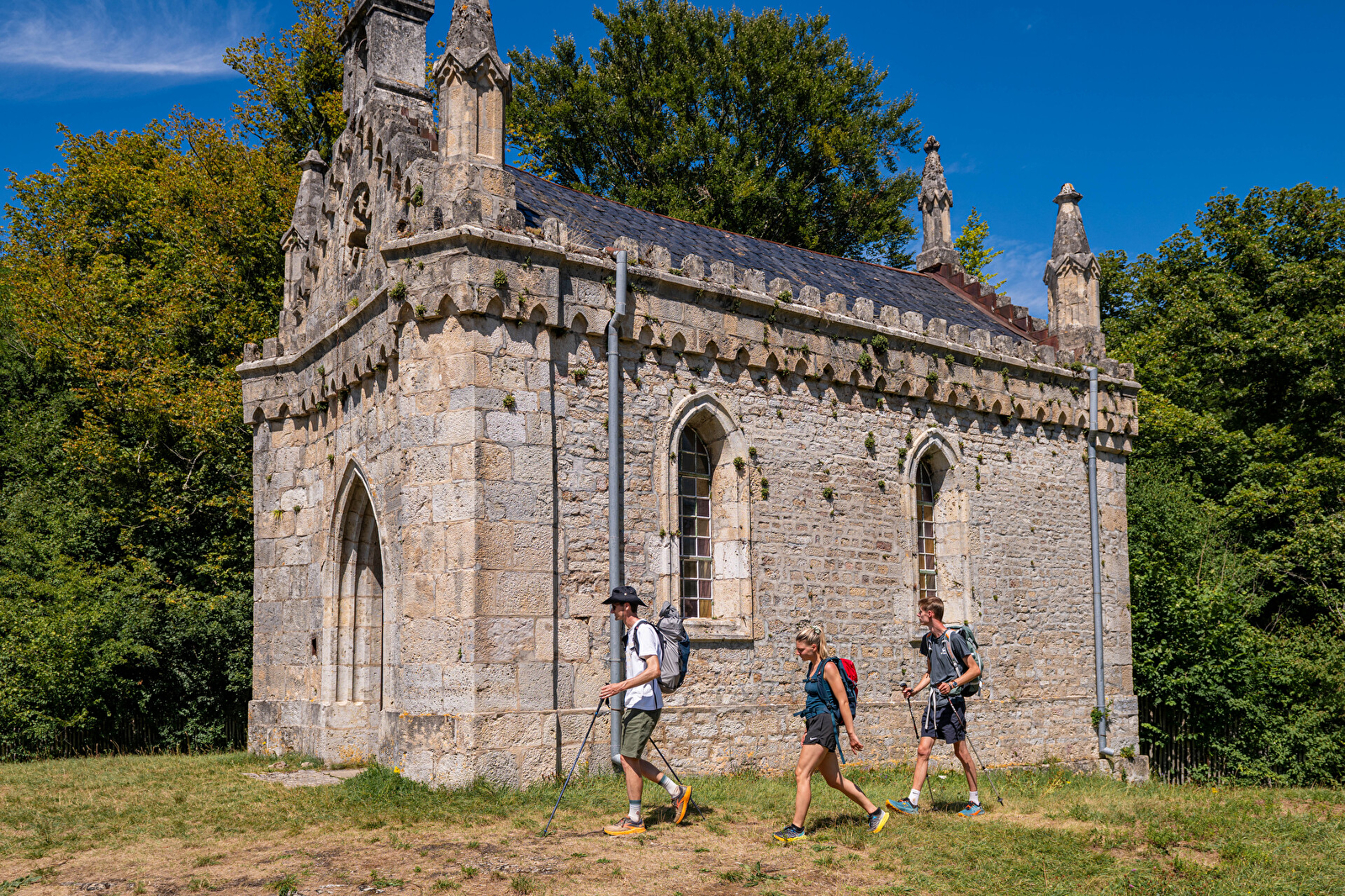 After the small bridge, turn right and walk alongside the fish farm. Climb the hill and follow the yellow and blue signs to a large stone house. You'll see a little Virgin Mary in a niche. You are now in Montivernage.