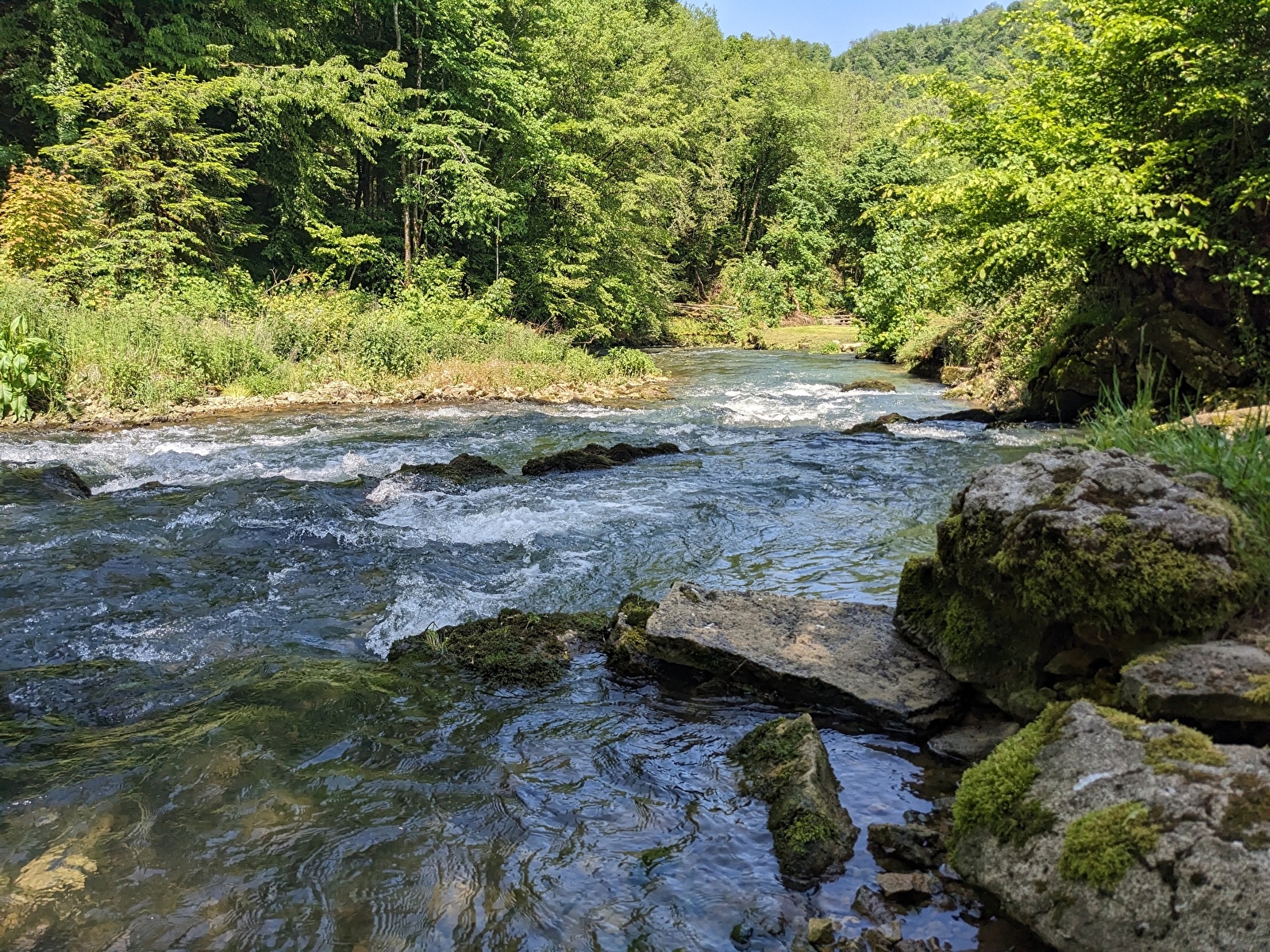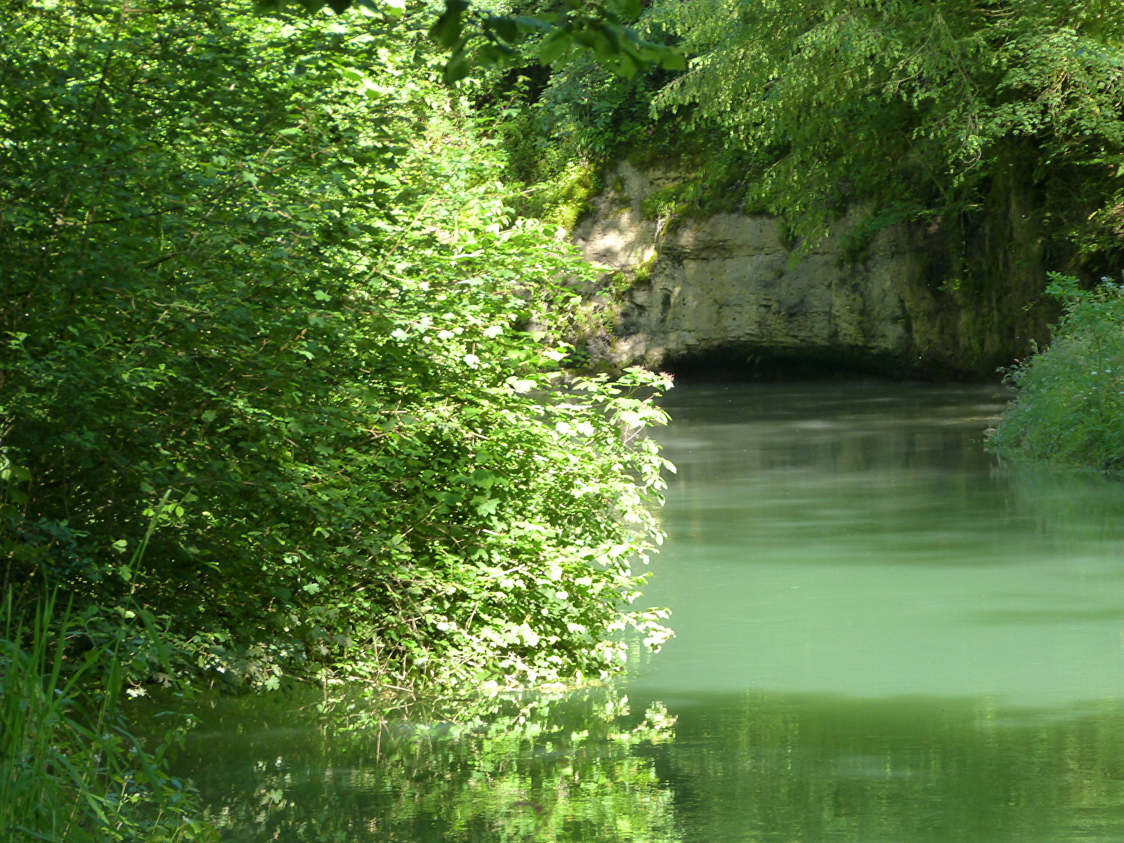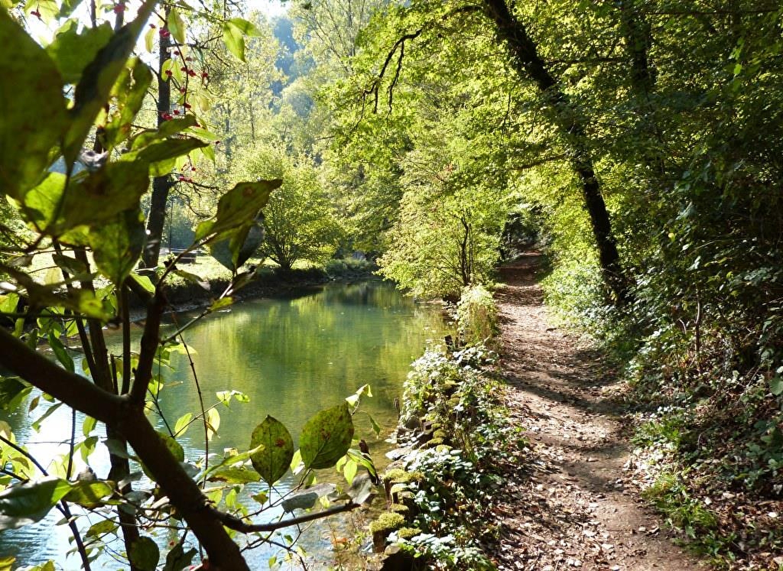 Pass the Auberge des 3 Ponts then turn left to discover the green spring. From the green spring, retrace your steps and follow the signs to the blue spring (opposite). Retrace your steps and turn right. Continue along the road (about 700 m) back to the church in Cusance.