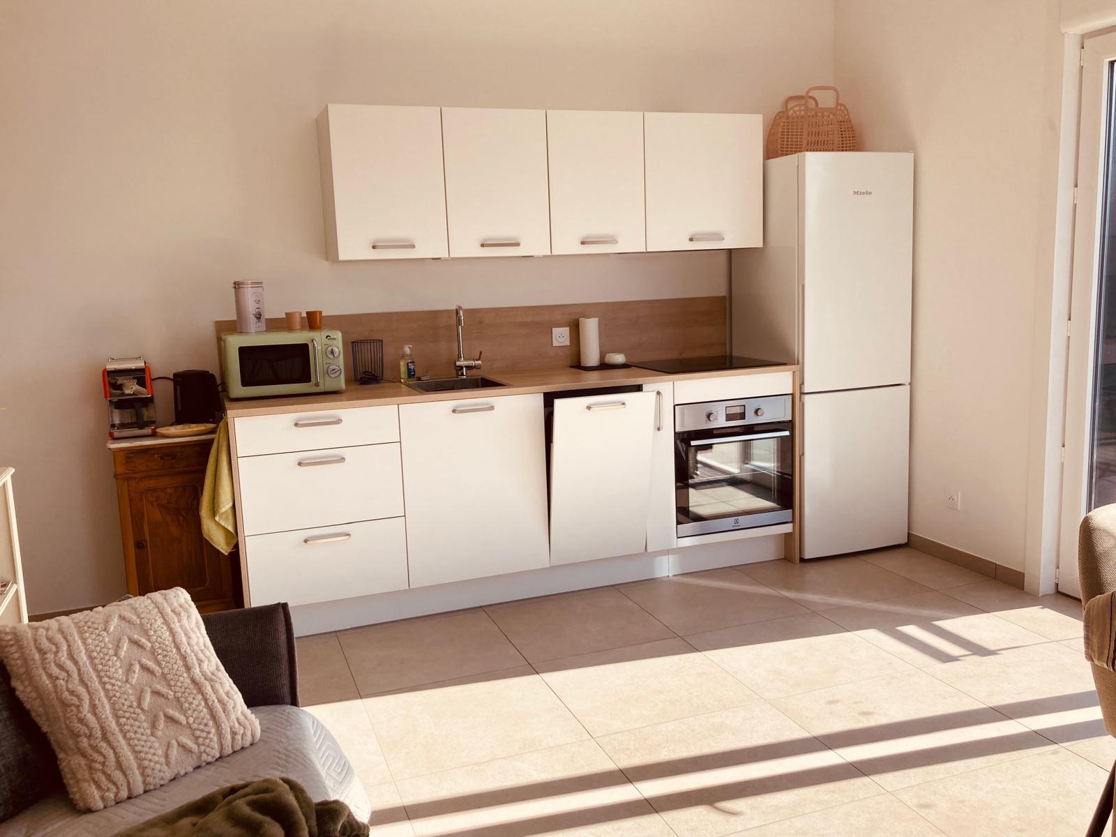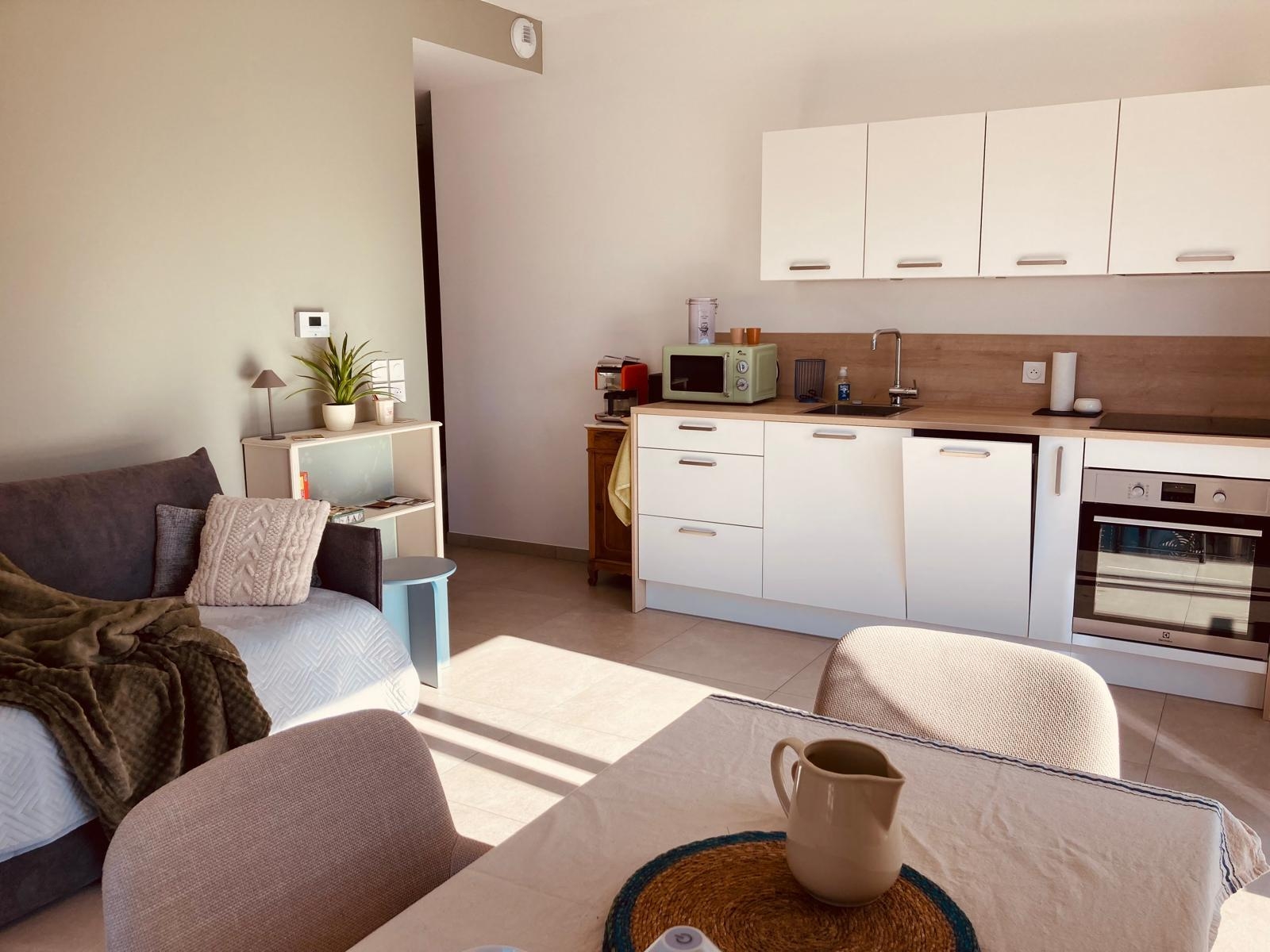 It comprises a quiet bedroom with a double bed (160 x 200 cm), a bright living room with a sofa bed and a dining area for four people, as well as a fully equipped kitchen. You can also enjoy a terrace and a private garden for relaxing.
