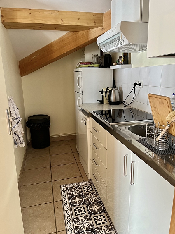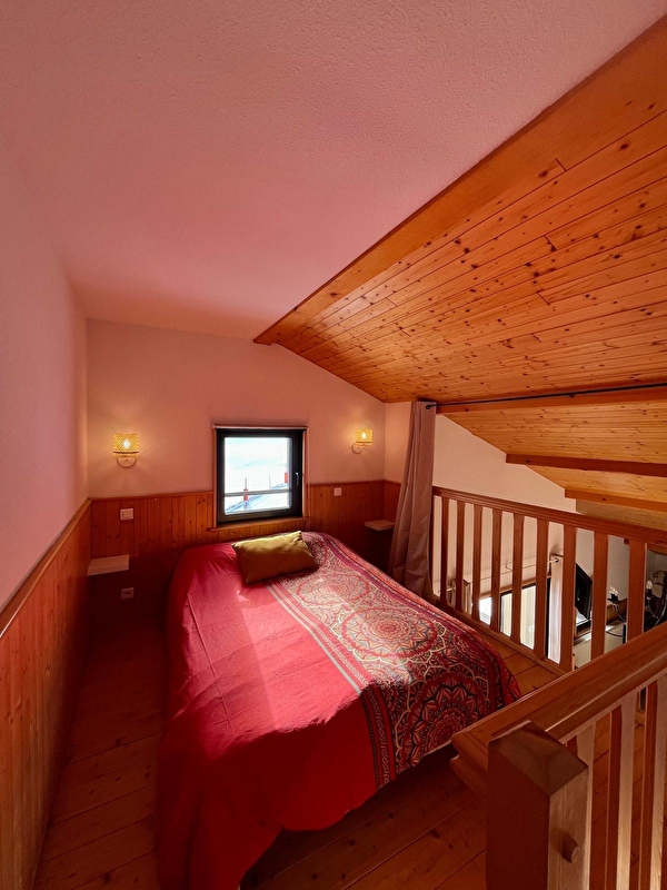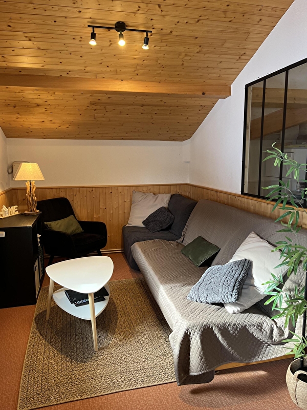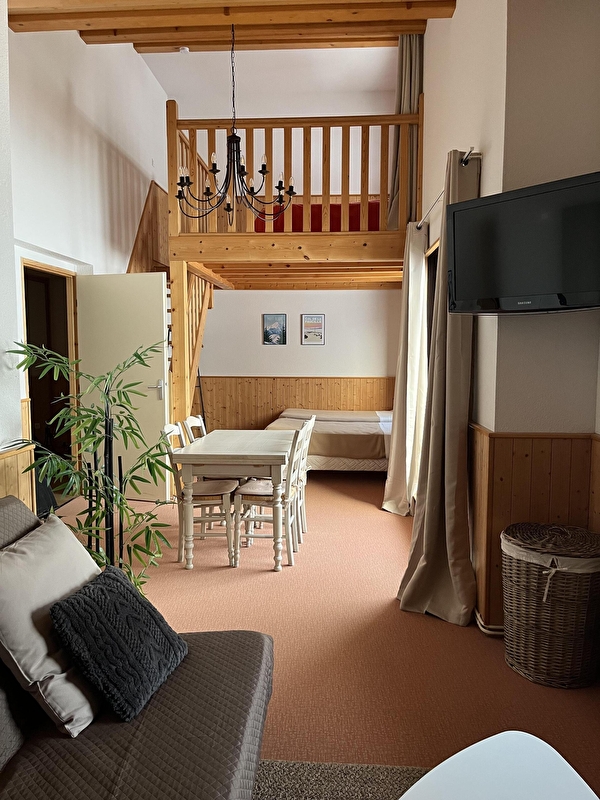 The apartment offers a cosy living space with a lounge featuring a sofa bed, a sleeping area with two single beds, and a mezzanine with a double bed.
