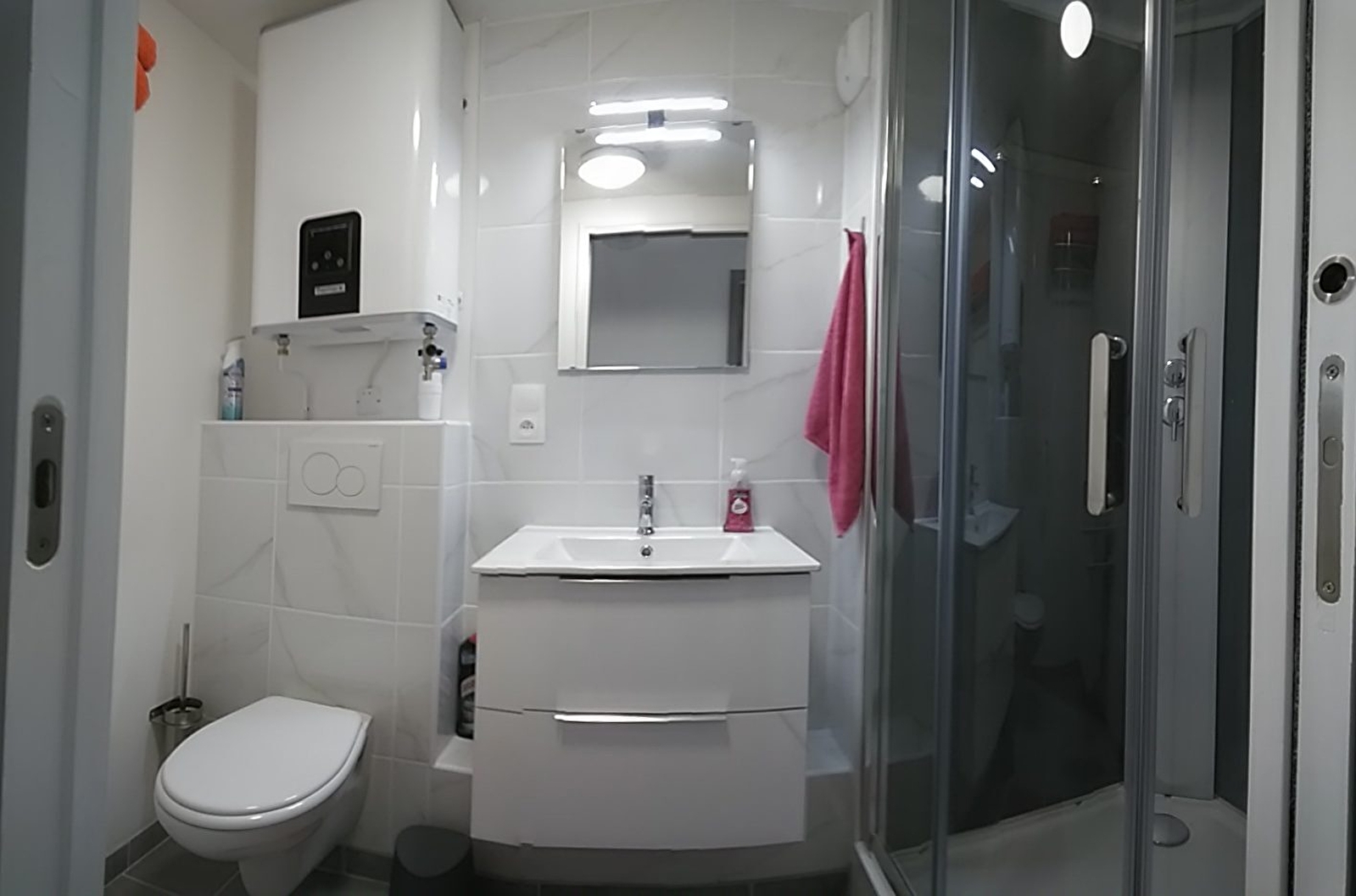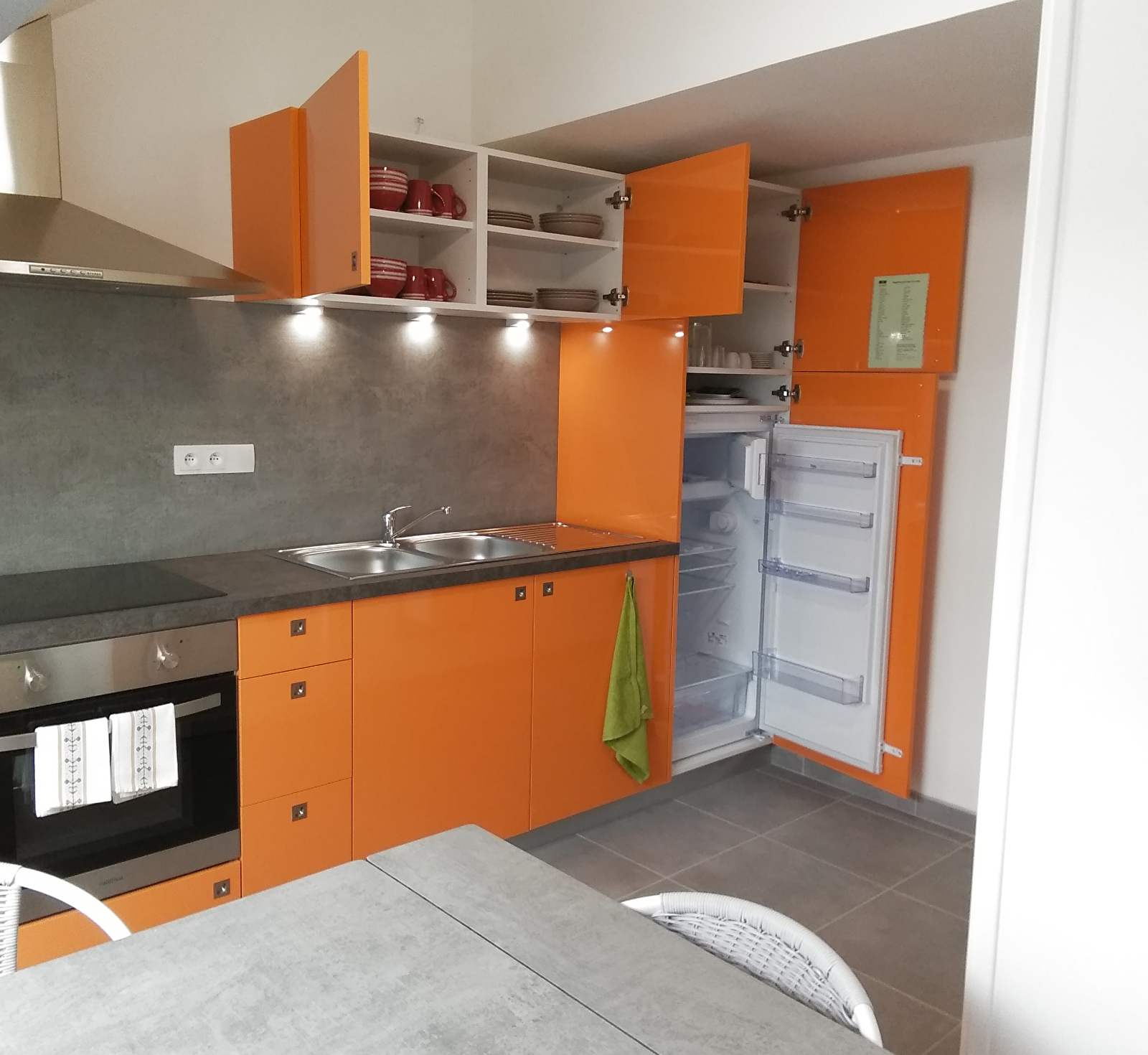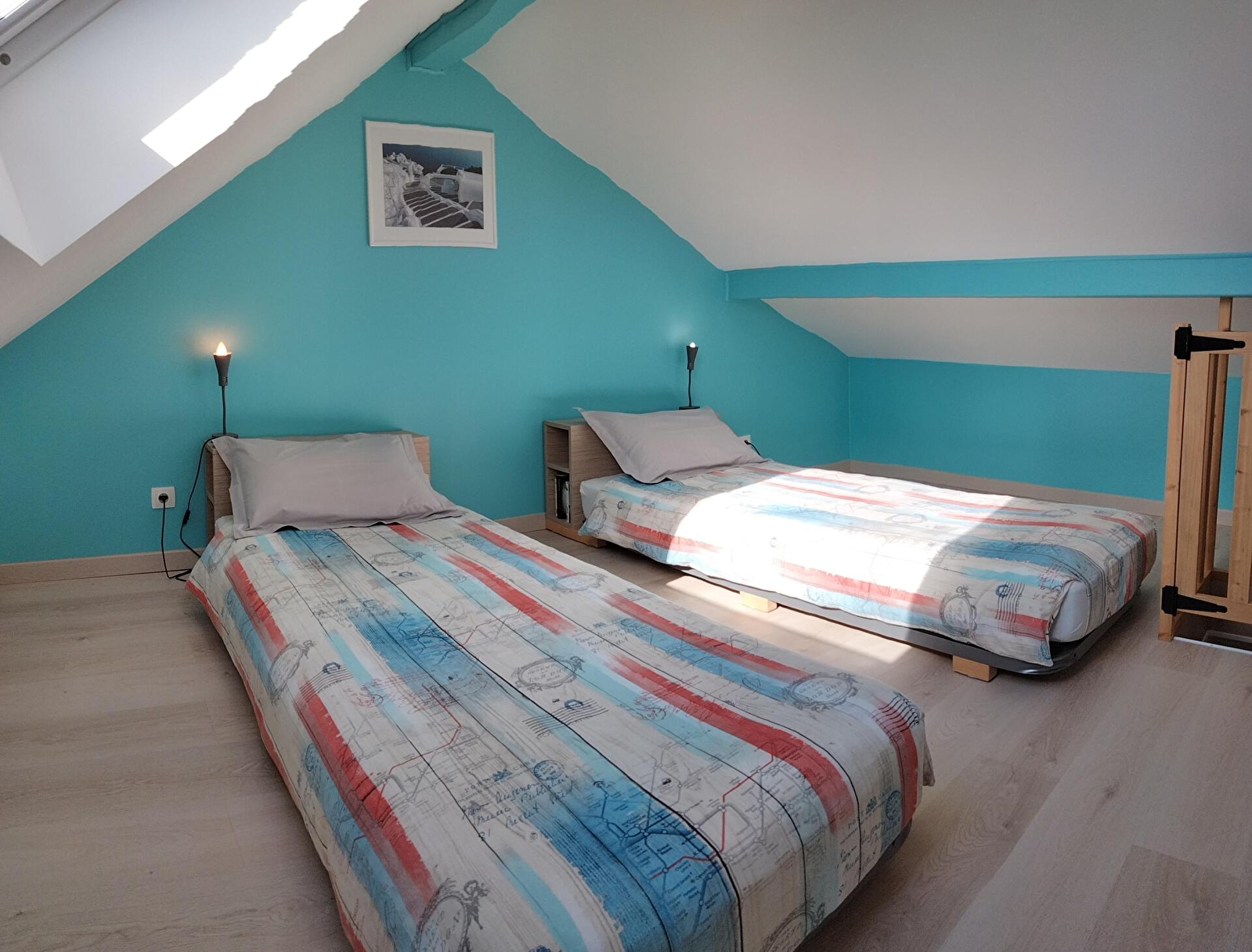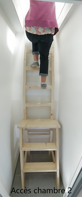 The flat has a fully equipped kitchen, a bathroom (shower, washbasin, toilet) and two bedrooms (one with a 140 x 190 bed and the other with two 80 x 200 beds). Please note that access to the second bedroom is via a ladder.