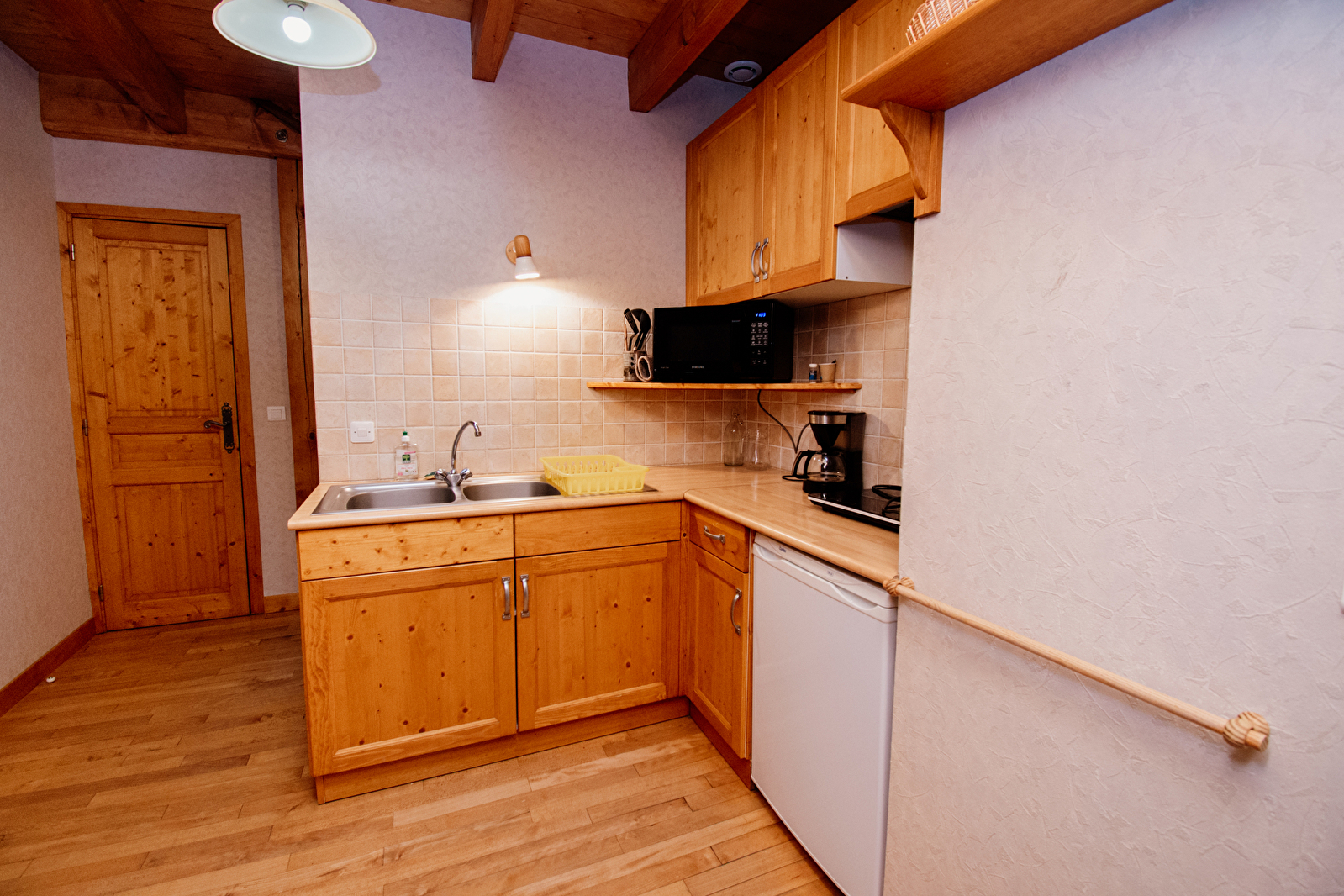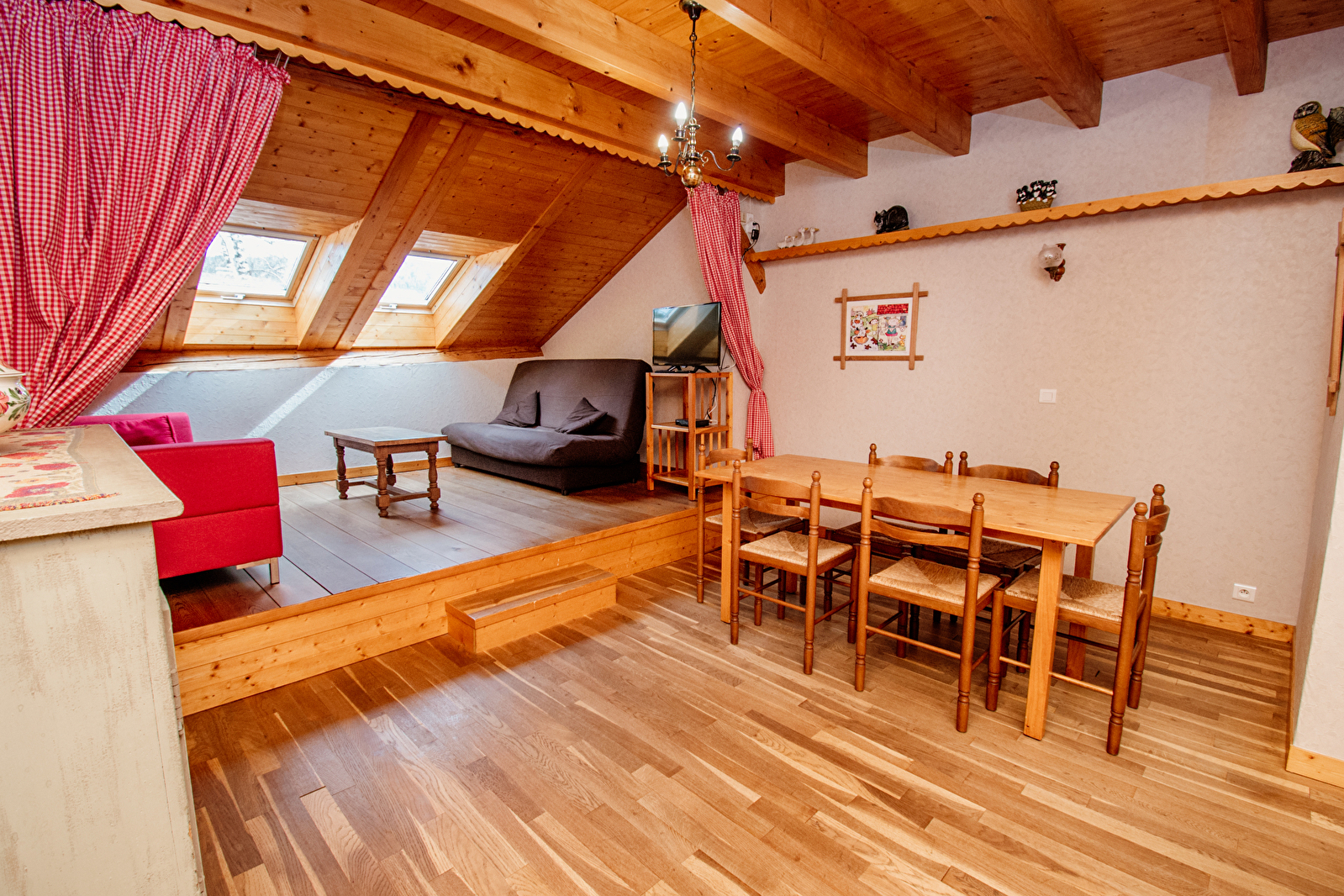 Located in the middle of the farmhouse, the flat comprises a large living room with kitchen area, dining area and lounge with sofa bed that can be separated by a curtain, and also a bedroom with a double bed and a single bed, a bathroom with shower and a separate toilet.