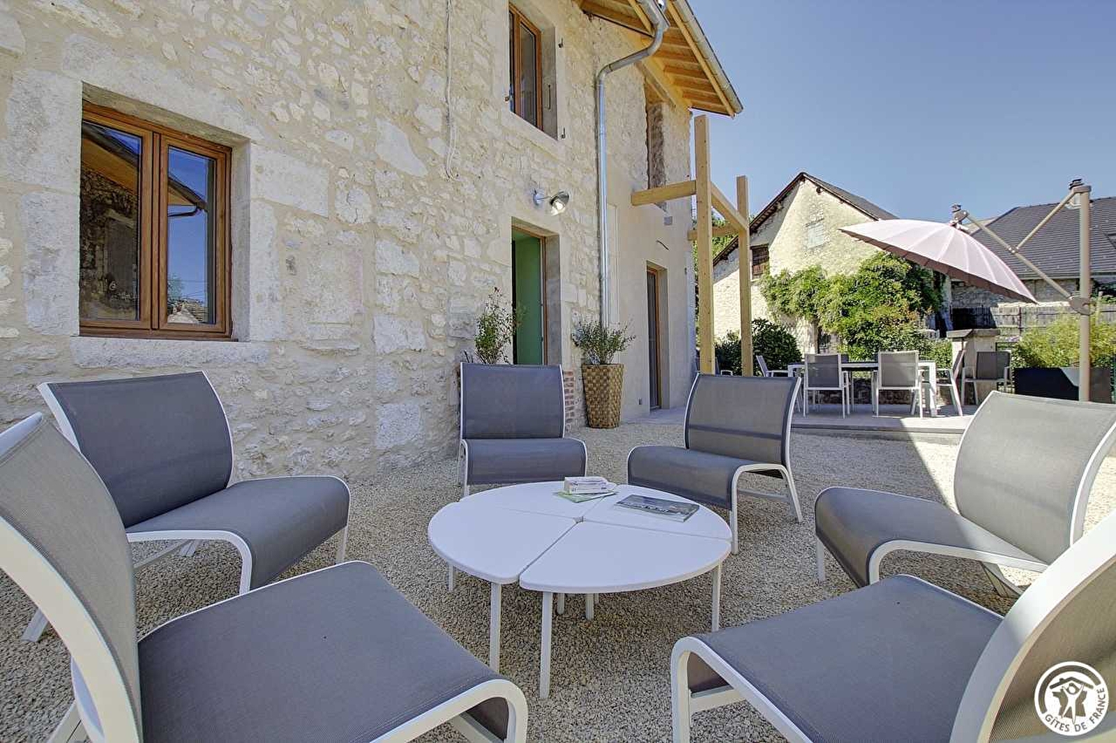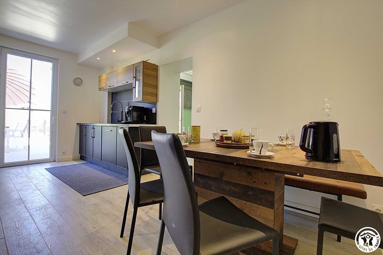 About 4 km from Le Colombier, the gîte is located in the center of the village and next to a communal car park. Through a secure gate, you enter the private courtyard with terrace, equipped with spacious garden furniture. This completely renovated gîte is designed to accommodate up to 6 people with its three bedrooms and two bathrooms. The main entrance opens onto a hall which serves; on your left - a relaxation lounge, and on your right, an equipped and functional kitchen with dining area. You can directly access the terrace. A toilet with washbasin is available on the ground floor. Two staircases will allow you to partially discover the bedrooms. The wooden staircase, accessible from the hall, leads you to two bedrooms: a first bedroom with a 140*190 bed, and a second bedroom, with two 90*200 beds; a bathroom. A laundry room at your disposal (with washing machine, dryer, and sink) and finally in the extension, a second staircase in wood and steel, overlooks the third and last bedroom. This master bedroom, with balcony and private lounge area, includes 140*190 bedding, an office space, a bathroom with integrated WC. For the happiness of young and old, a large room (unheated), ideal for meeting and sharing moments of relaxation, time for a reading or during a game of table football. A partly covered patio is fitted out to enjoy a rest area.