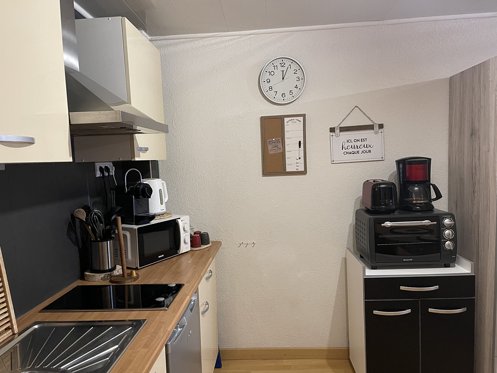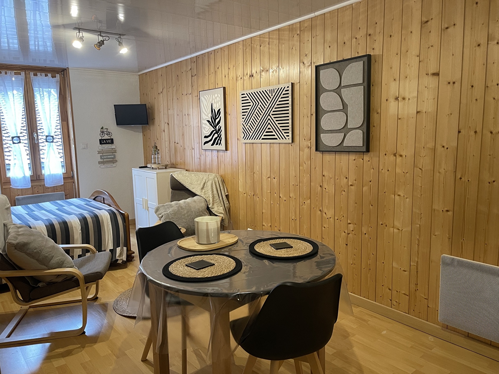 Hall d'entrée - pièce principale avec kitchenette, coin repas, fauteuil et 1 lit 2 pers - salle de bain - wc - chauffage électrique
