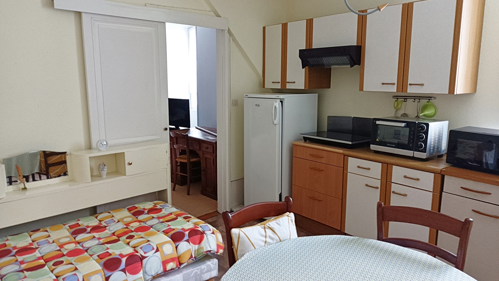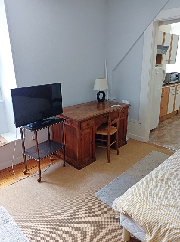 This 40 m2 furnished apartment, comprising a bedroom-living room with a 140 cm bed and a kitchen with a 90 cm bed, is ideal for 3 people. The kitchen is functional and well-equipped.
