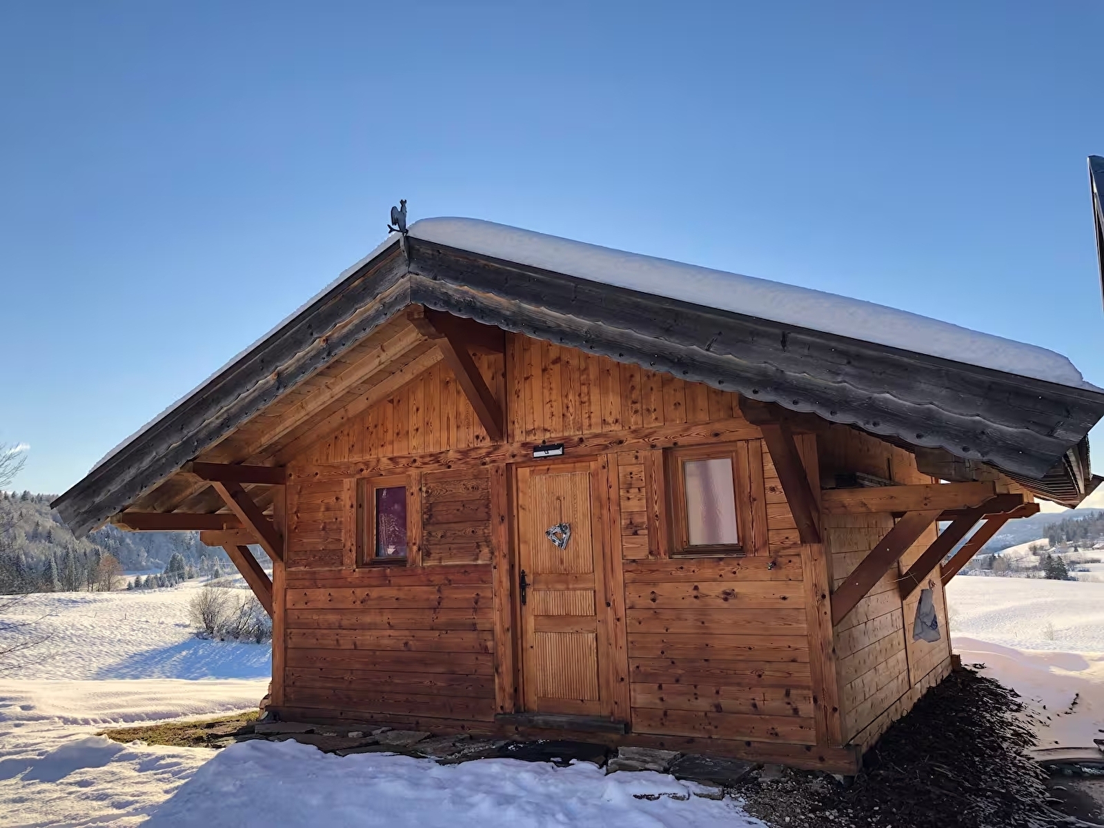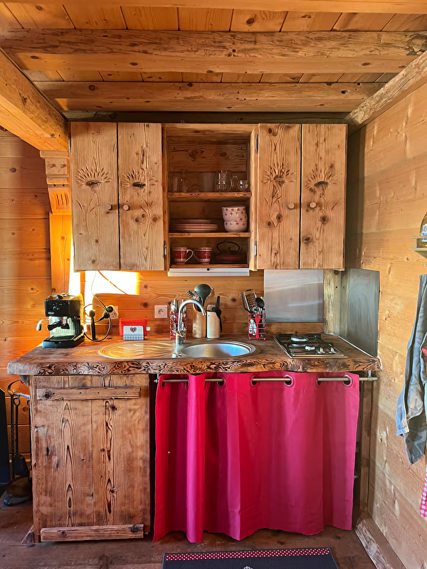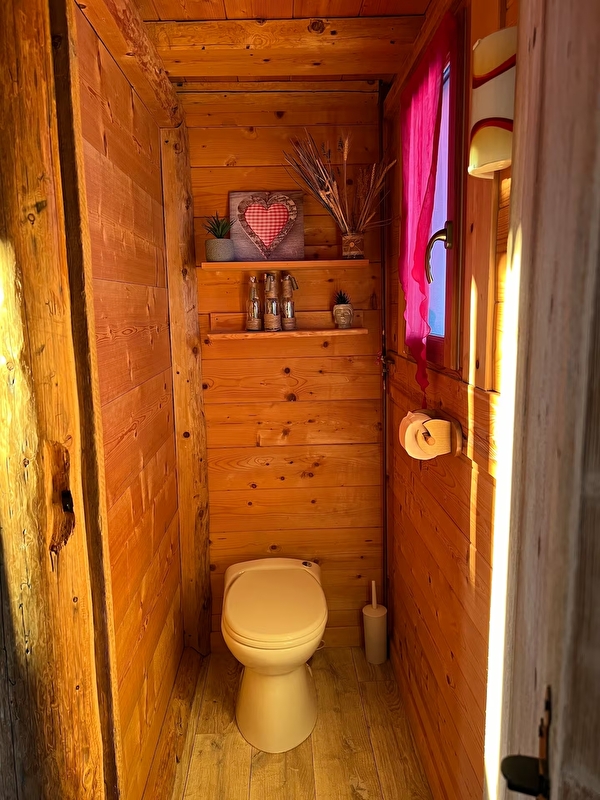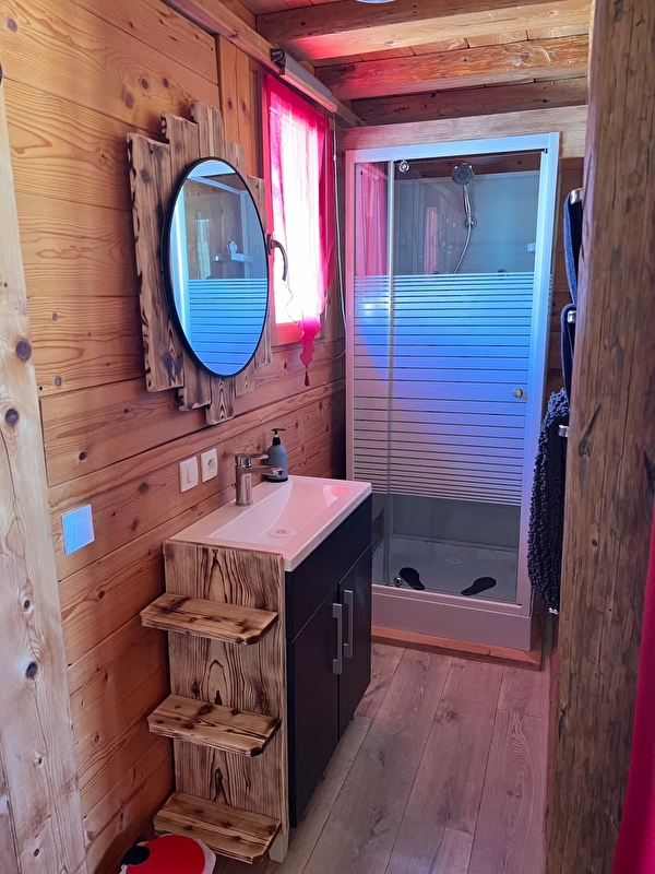 Chalet with large terrace. A 30 m2 room with a small wardrobe, a table, a 140/200 bed, a 2 person sofa bed (140x200), a large TV, a clothes cupboard. Shower room and washbasin, separate toilet. Bed linen, towels and crockery provided.