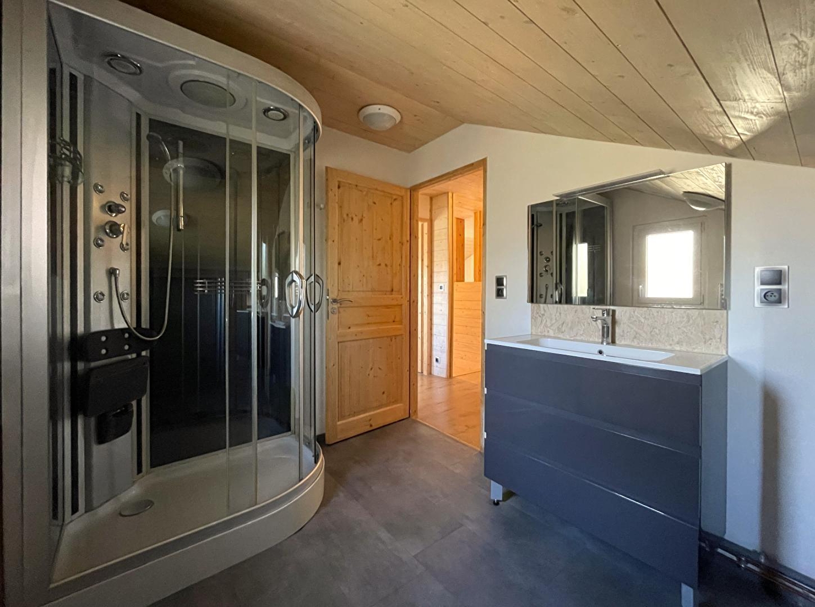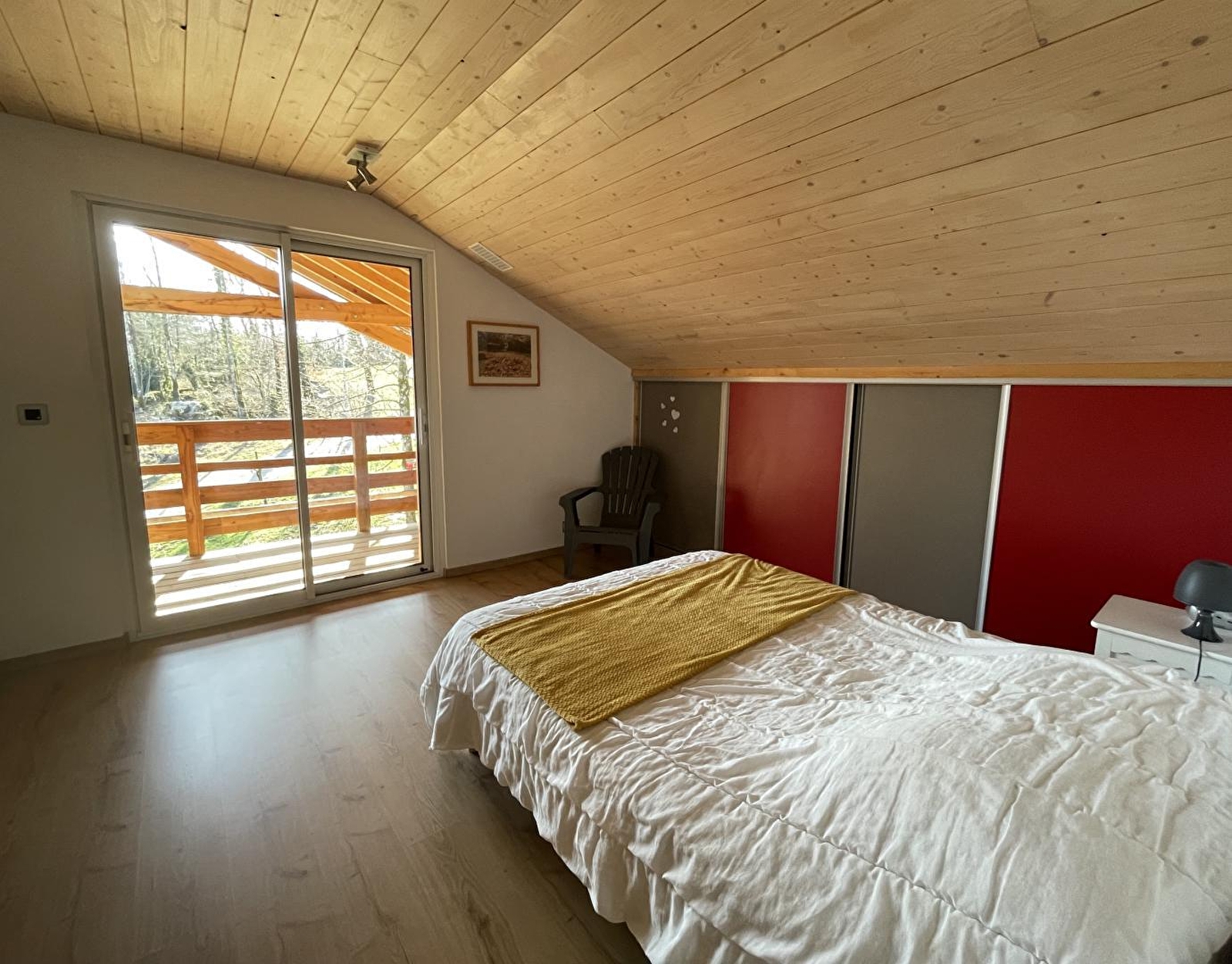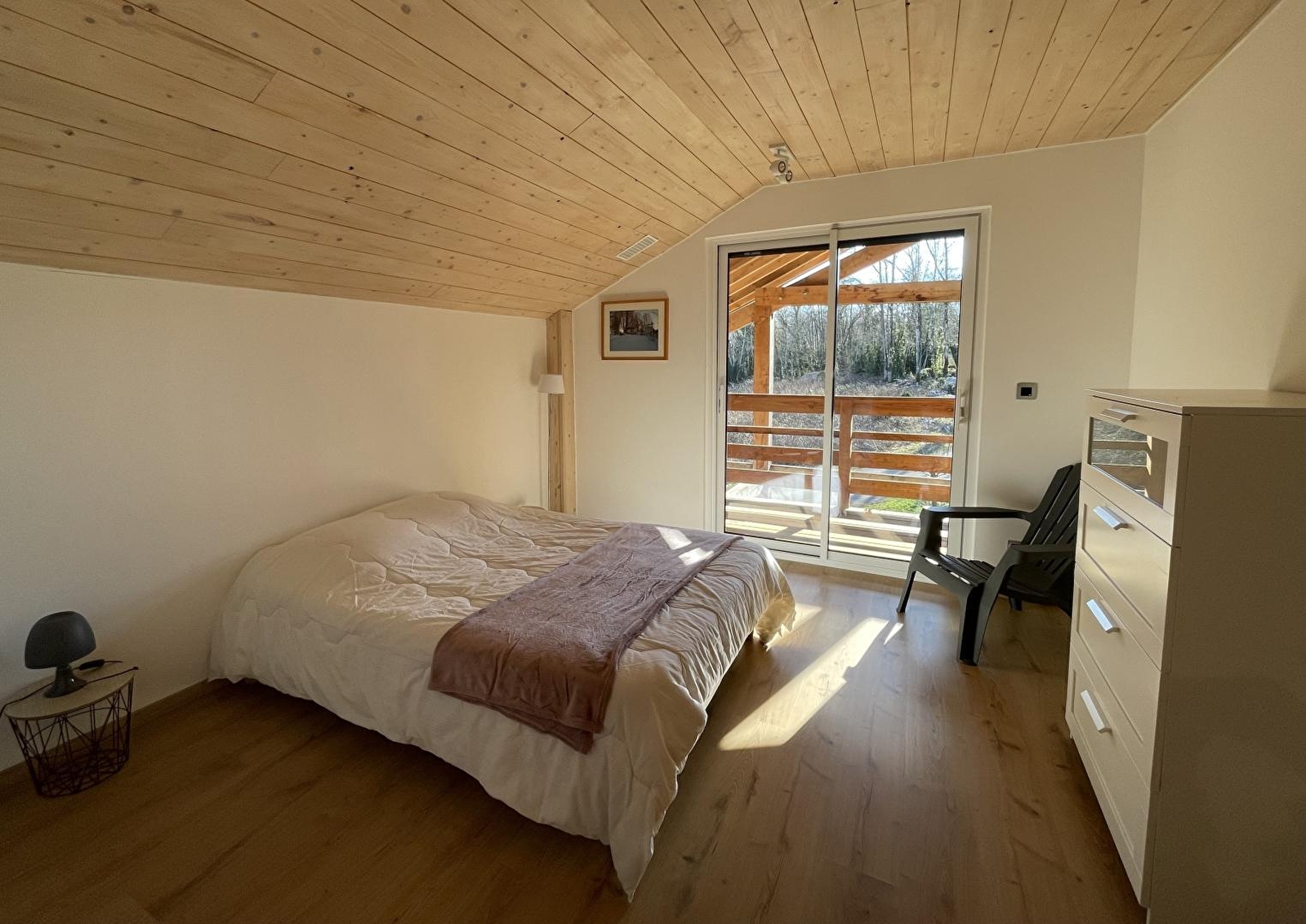 The New Hampshire Chalet is Anne-Louise's family dream: a place to gather and create new memories, and a place to share. Originally from New Hampshire in the USA, the owner fell in love with the region of lakes and small mountains that remind her of home. This modern, eco-friendly chalet comprises a living room with a fully-equipped kitchen, a sitting room with TV and wood-burning stove, a bedroom with 1 double bed (140x190), a shower room with bath and walk-in shower and a separate toilet. Upstairs is a mezzanine with a small sitting area featuring a TV, books and board games, an office area ideal for teleworking, 2 bedrooms each with a double bed (140x190) and 1 bedroom with 1 double bed (140x190) and 2 bunk beds, a shower room with shower and a separate toilet. Outside, there is a lovely terrace with garden furniture and barbecue, and a garage for storing your bikes or motorbikes. Ideally located for lovers of cycling, walking and horse-riding, you can also explore the lakes and waterfalls and get to Bourg-en-Bresse in 30 minutes to visit the famous Brou royal monastery. There is also a pétanque court on site (communal but just behind the chalet on the dirt track). Tennis 8km away (Aromas). There are also marked hiking trails on site. Please note: the basement is rented all year round.