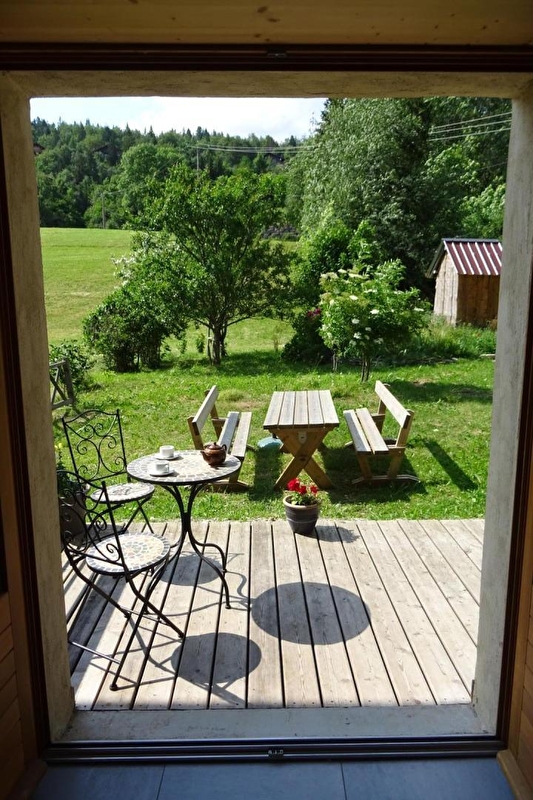 This gîte in an old farmhouse adjoining the owner's house comprises a fully-equipped kitchen on the ground floor, a lounge area with a sofa bed and a separate toilet. Upstairs: mezzanine with 2-seater sofa bed, TV + DVD player, reading area, 1 bedroom with 1 double bed (140cm) and 1 bedroom with 1 double bed (140cm) and 1 single bed (90cm), shower room with walk-in shower and WC. Outside, you can enjoy a 15 m² terrace accessible directly from the kitchen, opening onto the countryside with garden furniture and barbecue. There is also a closed storage area for your skis, bikes, etc. Ideally located, just 2 km from the village centre, where you'll find all the shops you need (restaurant, supermarket, cheese shop, tobacconist's, etc.). Mountain bike, cross-country ski and snowshoe trails leave from the gîte, and a snow line for learning to ski downhill is 2 km away. The Chaux Neuve polar park and the Saine and Langouette gorges are ten minutes away. Pet deposit: €300