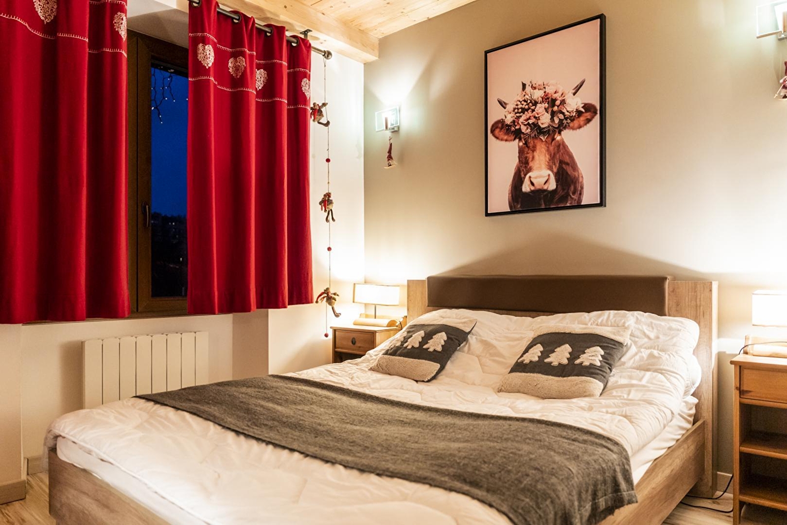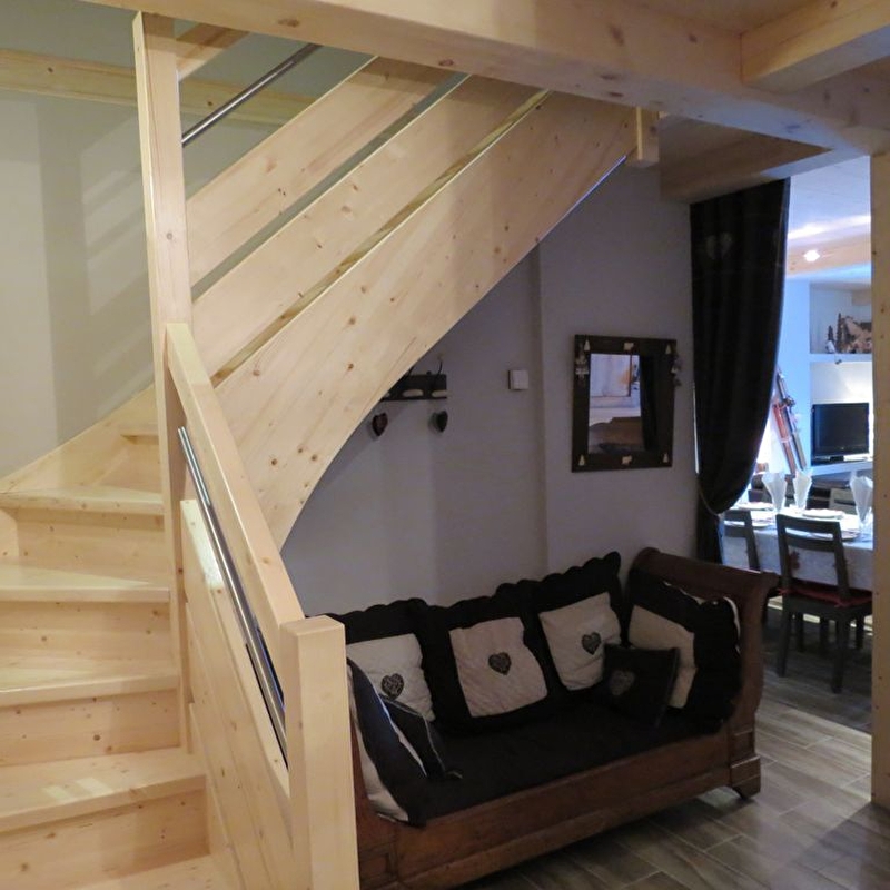 Let yourself be charmed by this completely refurbished duplex apartment with a mountain feel. Located on the 1st floor of the owners' house, it comprises a cosy living room with a fully equipped kitchen (including fondue and raclette machines), a lounge, a shower room, a separate WC and a bedroom with a double bed (160*200). On the 2nd floor, you will find 2 further bedrooms, each with a double bed (160*200) and a single bed, and a bathroom with WC. Terrace with garden furniture, barbecue and plenty of children's play equipment: swing, tree house, bicycles, etc.