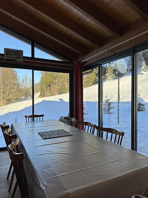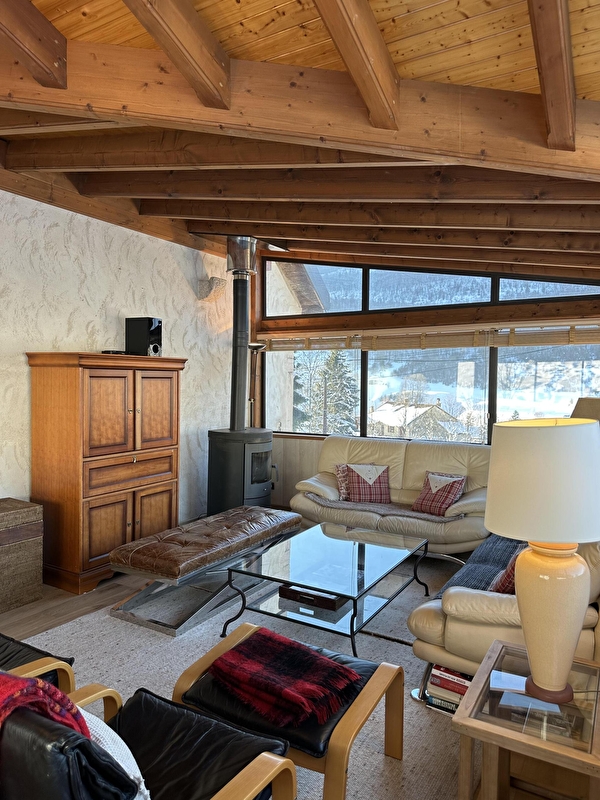 This large flat on the first floor has four bedrooms, two modern bathrooms, a fully equipped kitchen, and a magnificent glassed-in veranda with a wood-burning stove and a panoramic terrace offering unobstructed views of the mountains.