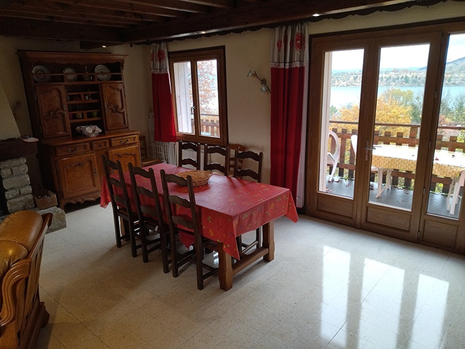 Detached chalet-style house on the shores of Lake Chalain. Ground floor: large living room with TV, fireplace, dining room and fitted kitchen, shower room with hydrotherapy shower and separate toilet. Upstairs: mezzanine with sofa bed for 2 people, bathroom with whirlpool bath, CH1: 2 single bunk beds, CH2: 1 double bed (160cm), CH3: 1 double bed (160cm) (can be divided into 2 single beds (80cm) on request) and separate wc. Adjoining enclosed garden with garden furniture and barbecue in summer, courtyard and large balcony with magnificent views over the lake. Enclosed private garage. Electricity: 15 kw/day free. RATES PER PETS: €4.5 per day