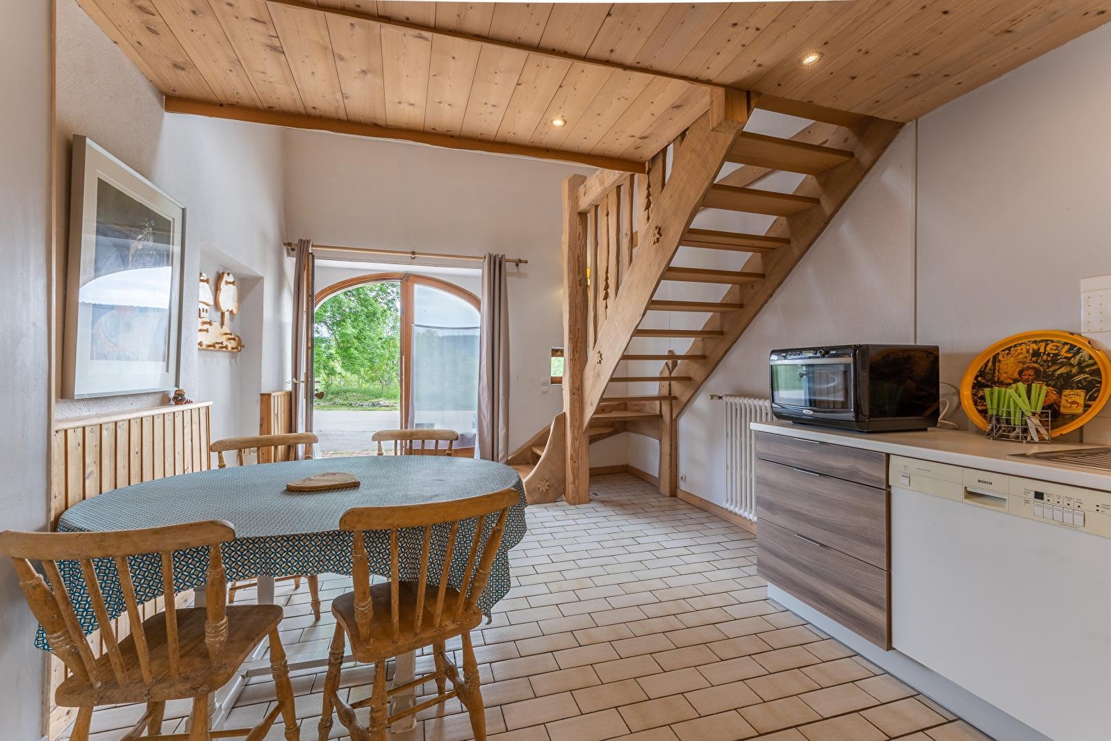 Juragites.fr In a peaceful hamlet in the heart of the Haut-Jura Regional Nature Park, Fabienne and Andrew welcome you to their gîte in an old farmhouse on the Grandvaux plateau in Saint-Pierre: for a mountain holiday just the way you like it, with family or friends! From the house, the view over the wide-open spaces of the Grandvaux invites you to go hiking, skiing, snowshoeing, cycling... depending on the season and your mood! And don't forget the Abbaye lake, less than 2 km away, where you can swim or skate in summer or winter. Semi-detached house with on the ground floor: kitchen-living room (induction hob), bedroom 1: 2 single beds (90x200), shower room with WC. Upstairs: mezzanine with sitting area, DVD player and internet connection. Bedroom 2: 1 double bed (160x200), separate WC. Electric heating. Unenclosed courtyard and garden, garden furniture, barbecue. All utilities included in summer (except electric car recharging). Baby equipment available. Carport. Exercise bikes, subject to availability, details on request. In St Laurent, electric bikes can be hired. Loyalty offer: 2-week rental with free towels - 3-week rental with free towels and sheets.