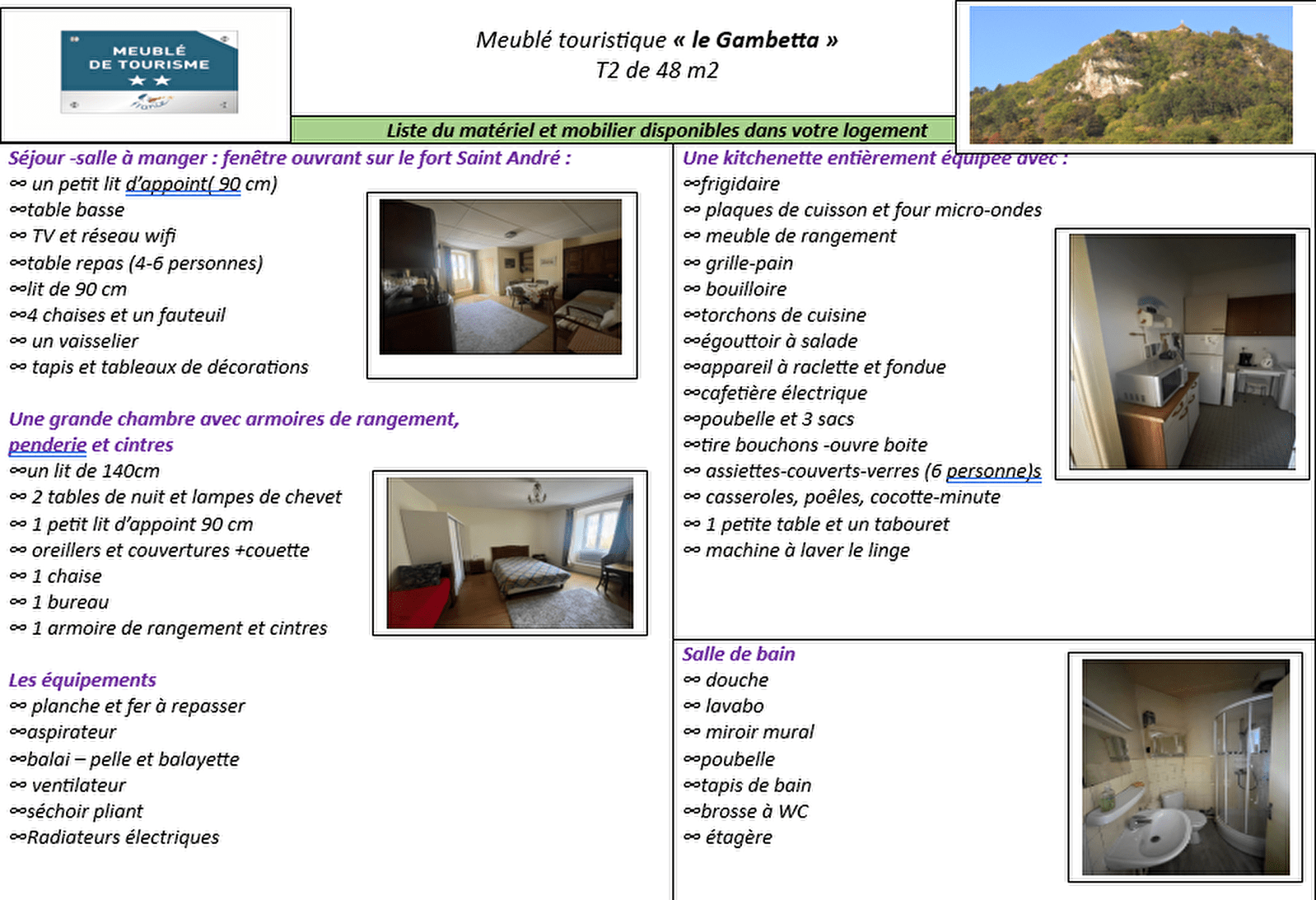 The Gambetta is a bright furnished apartment for 3 people, with an uninterrupted view of Fort Saint André. It has a spacious living room with a 90 cm extra bed, a large bedroom with a 140 cm bed and plenty of storage space. The kitchenette is functional and fully equipped. Located on the 3rd floor, it is accessible via a stair lift on the first two levels.