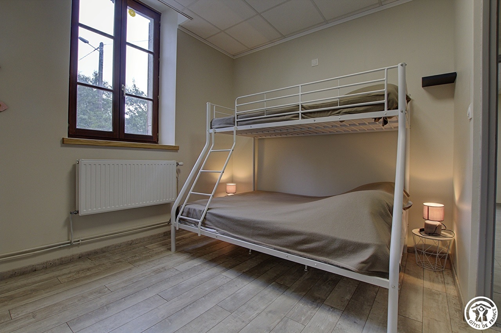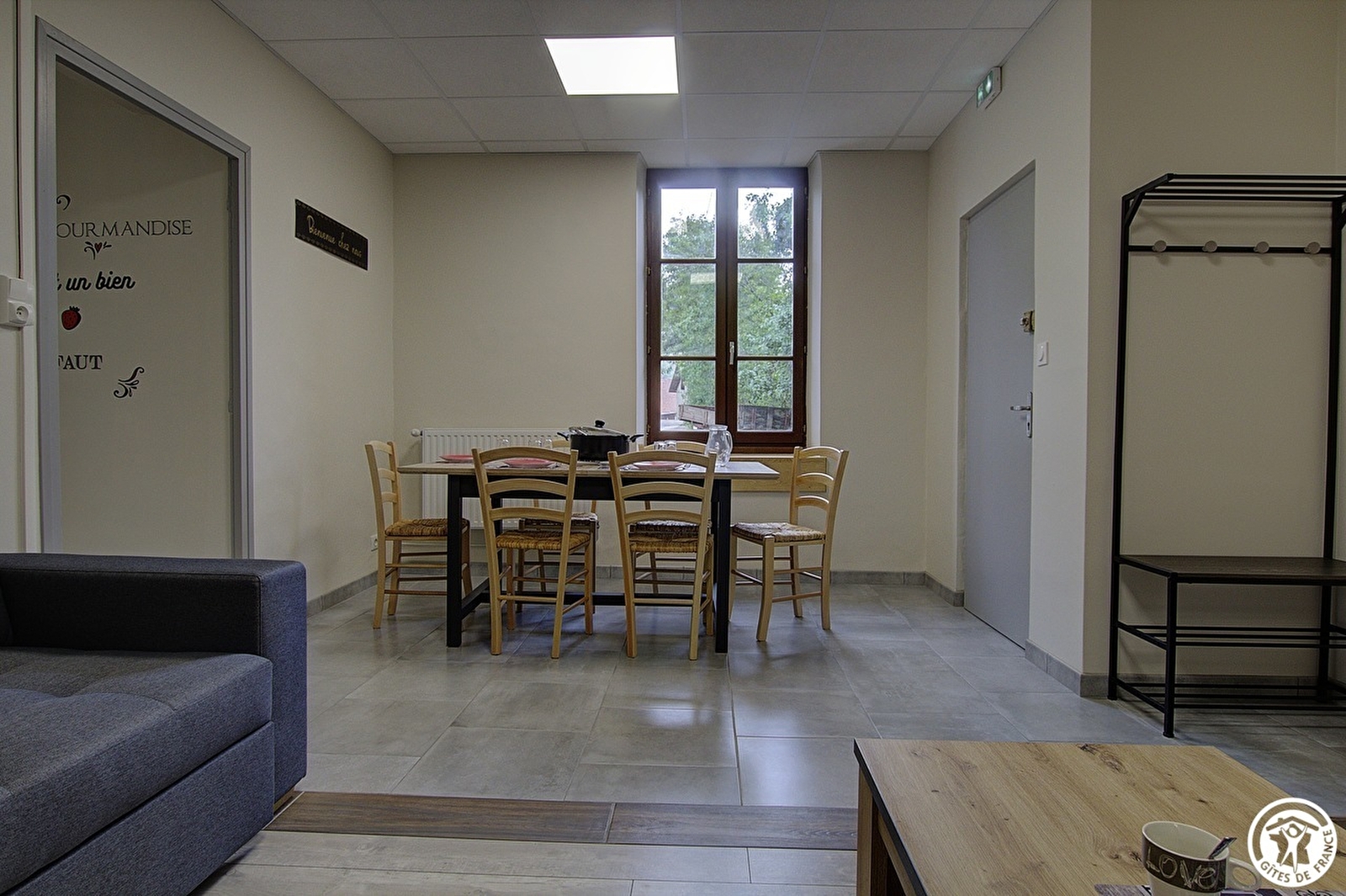 It is located in a communal building on the edge of the village, which also includes 1 year-round apartment. This accommodation comprises a fully-equipped kitchen, dining room, living room with fireplace, 5 bedrooms (2 to 4 beds), 4 showers, 3 WCs; there is also a small kitchen, a second living room. Two other bedrooms are accessible: a 3-person bedroom and a 2-person bedroom, a shower room and an independent toilet. Outside access to the small 5-person gîte. An outdoor area with a garden table is available to guests. For a short or long stay, you can gather up to 20 people, with everything you need. Central heating. Mini-golf and fishing pond on site, river 7 km. Paragliding take-off area. Restaurant 300m. Group prices (per night): sliding scale according to length of stay.