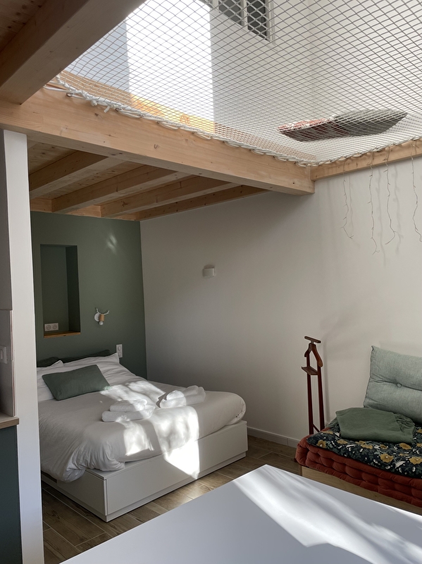 - A children's room (90 x 200cm mattress, like a hut perched in the canopy overhanging the living room above a relaxation net + a 60 x 120cm baby bed and a changing table