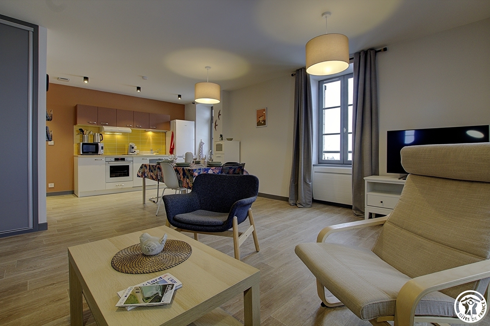 An interior staircase leads from the main entrance to a fully equipped kitchen that opens onto the living room with a sitting area and a small balcony. Three bedrooms make up this flat: two bedrooms with one 140x200 bed each and one bedroom with two 90x200 bunk beds and a cot.