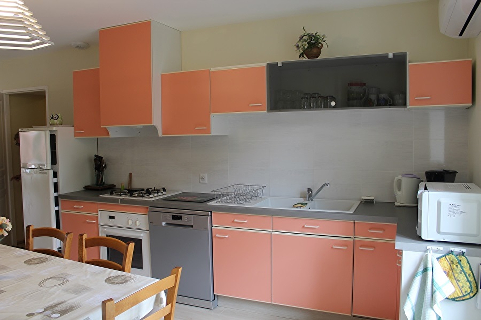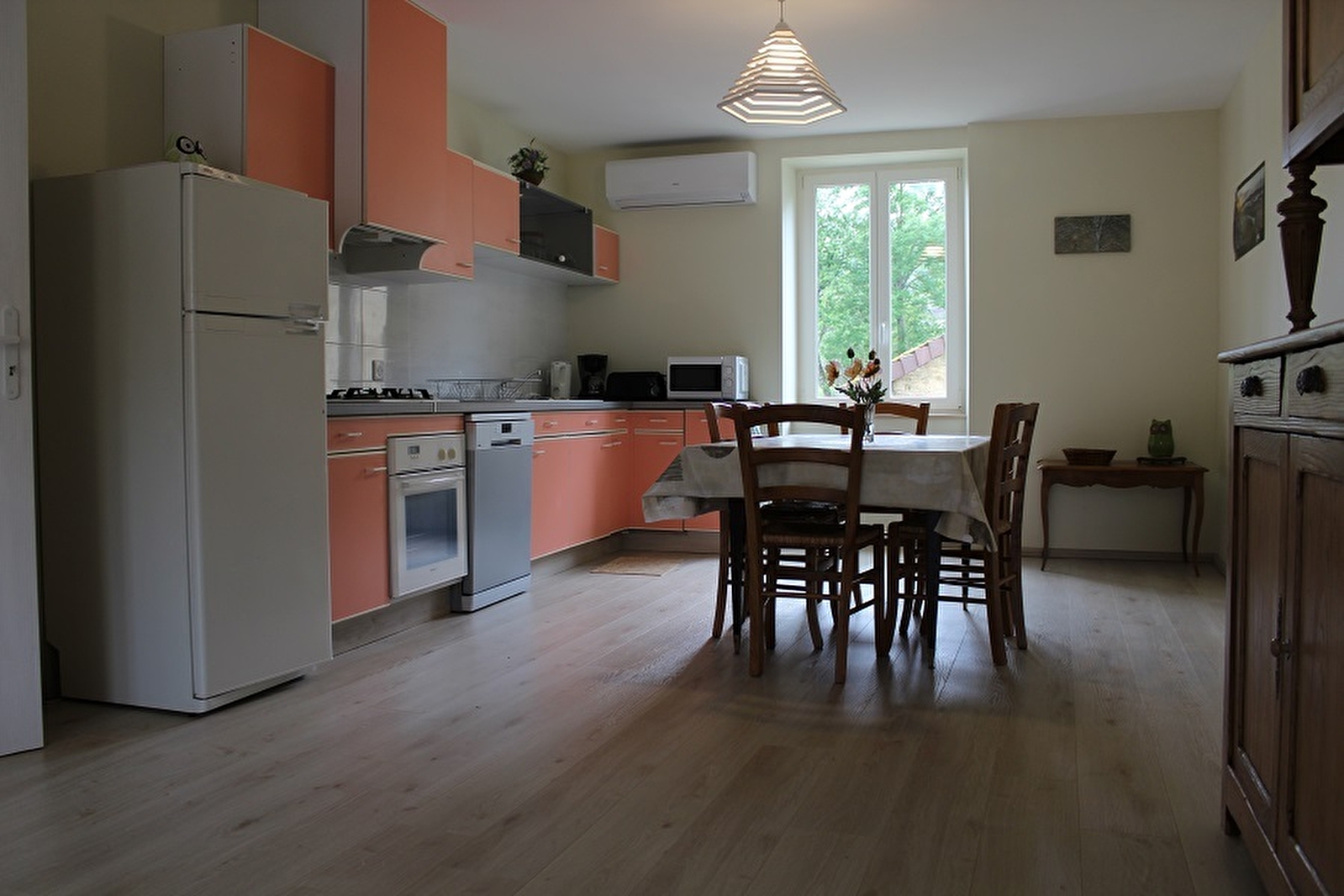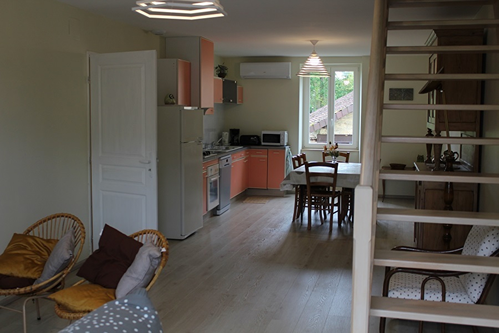 In the heart of the South Revermont vineyards, 14 km from Lons-le-Saunier, recently renovated air-conditioned gite for 4 people, in an adjoining house with the owners' house. Raised ground floor, entrance via balcony or barn. Ground floor: large living room with sofa bed, television, fitted kitchen (small electrical appliances, oven, dishwasher), shower room with shower, washbasin and washing machine, iron, toilet. Upstairs: a bedroom with a double bed (possibility of a cot), a bedroom with two single beds, a shower room with shower and toilet. Outbuildings: barn, cellar with table football and table tennis table, attic with washing line. Outside, there is a terrace where you can enjoy the fine weather. In the village, two winegrowers will welcome you to their tasting cellar, visit La Caborde, hiking, mountain biking, greenway (mountain bike, VTC, electric bike and children's trailer hire in Lons-le-Saunier), caves, remote areas, waterfalls and other natural sites, fishing, swimming (Vouglans, Clairvaux les lacs, Chalain, Louvarel lake, etc.), horse riding, thermal baths, bowling, casino, cinema, media library in Lons-le-Saunier, etc.