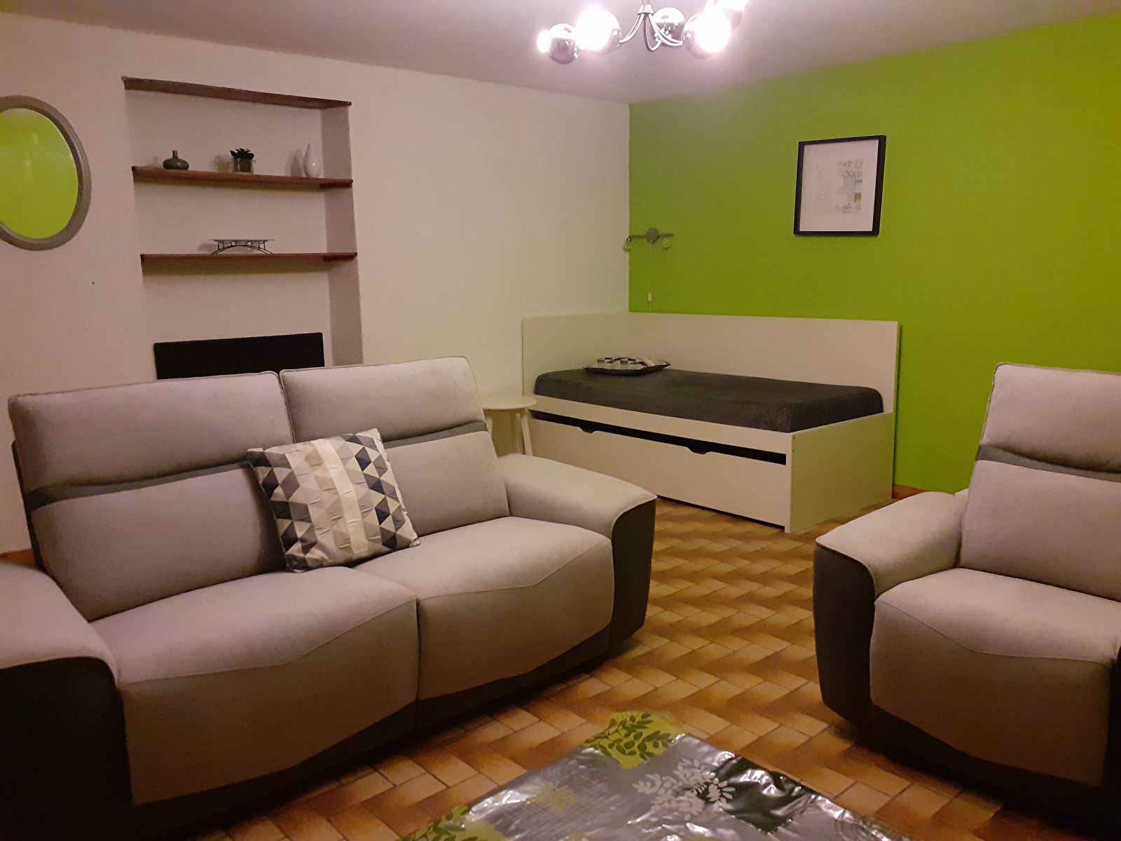 It comprises a fully-equipped kitchen (filter coffee maker, kettle, microwave, electric oven and ceramic hob, freezer) opening onto the terrace, a living room with 3 single beds (1 of which is a 90cmx200cm pull-out bed) and a bedroom with a 160x200 double bed. Baby equipment available on request.