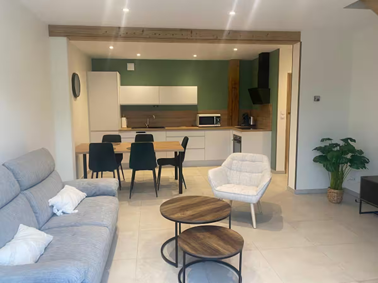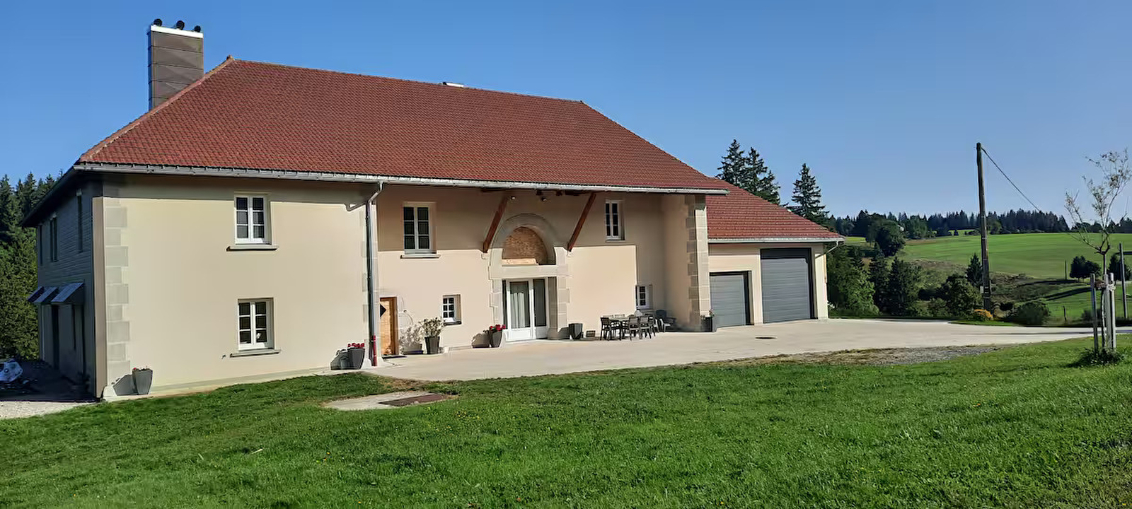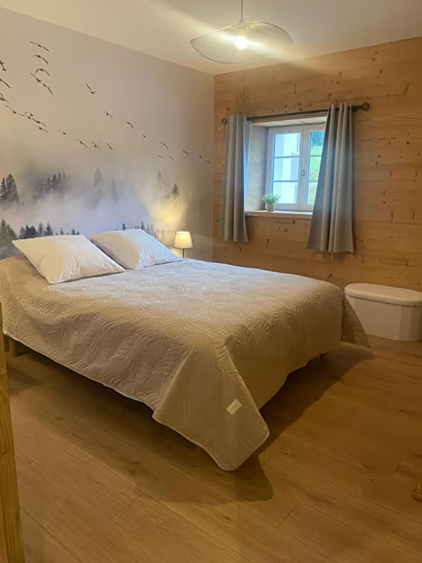 Welcome to our gîte "La Belle Vue". It is located on the ground floor of our house, with direct access to a terrace and an unfenced garden. It has a 30m² living room with a fitted kitchen and TV lounge, a bathroom with walk-in shower and a separate WC. Two bedrooms, one with a queen-size bed and the other with two 90x190 beds, upstairs. Non-smoking accommodation.
