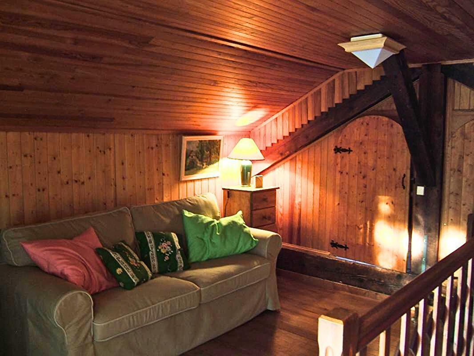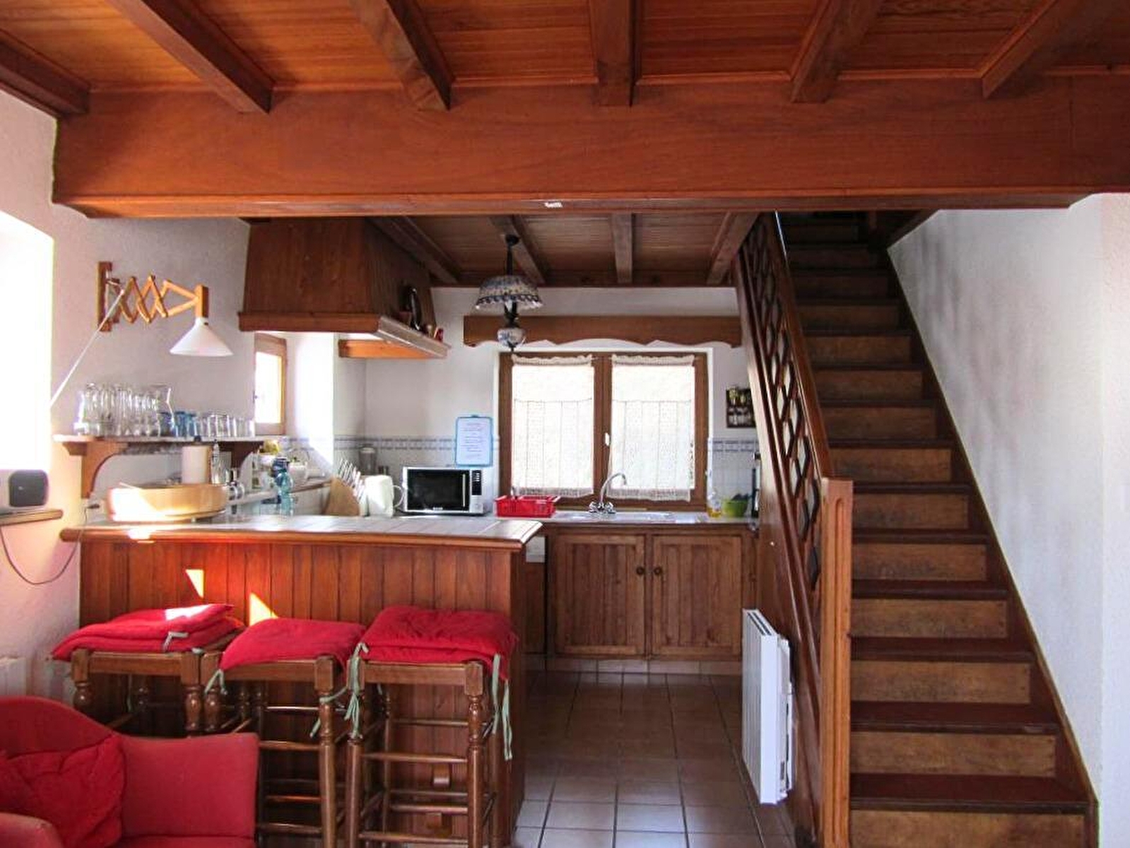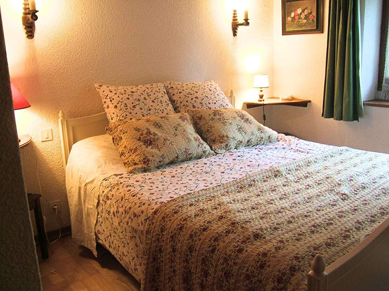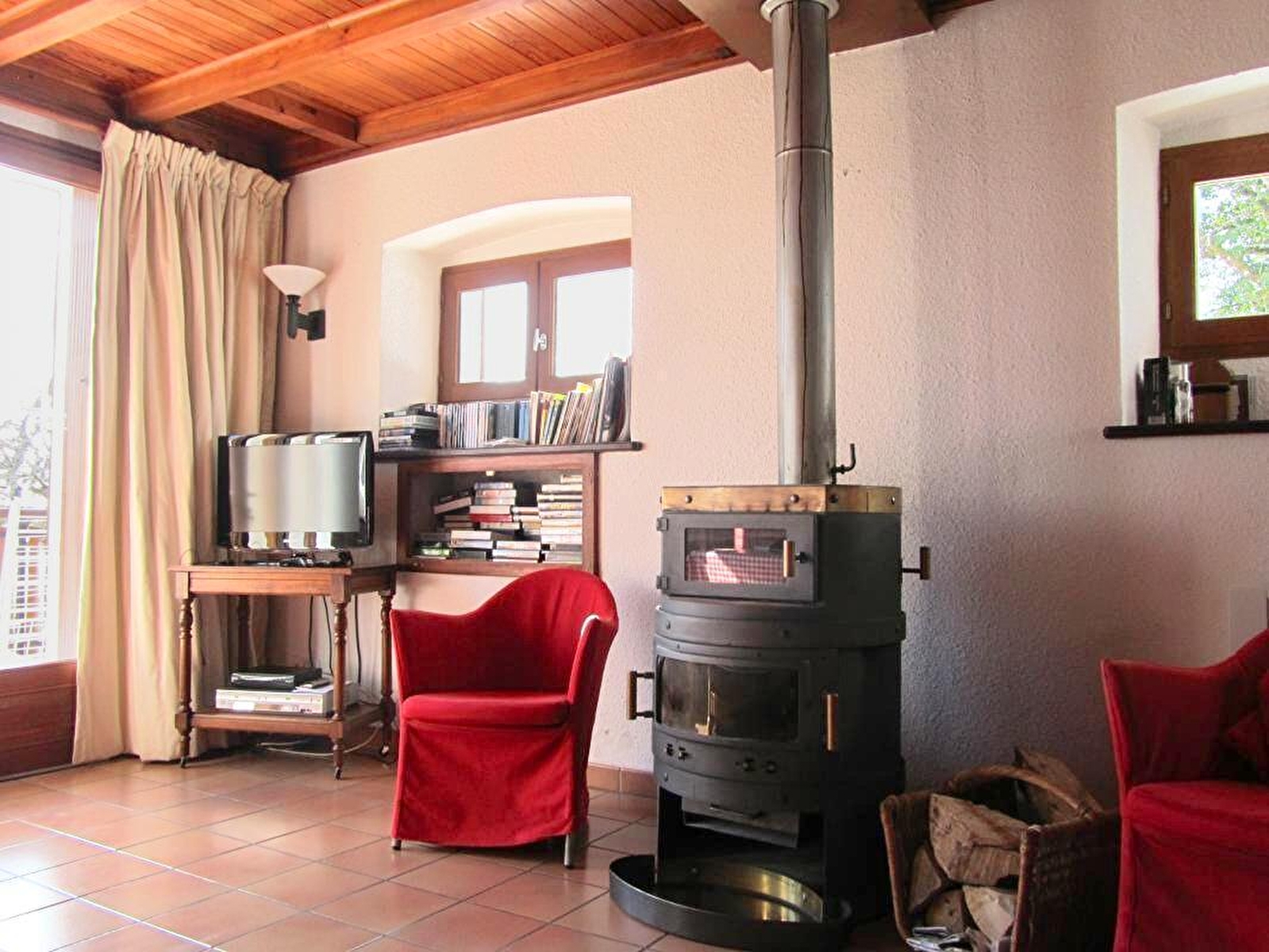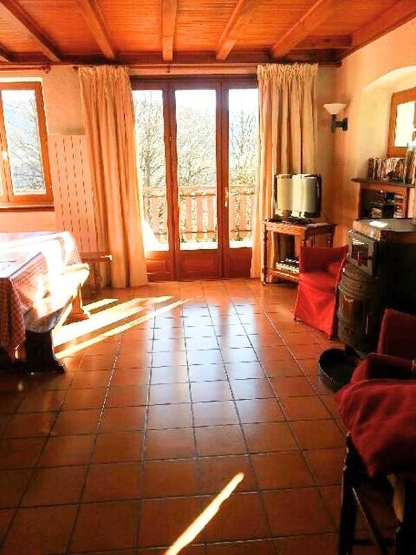 Detached house on 2 levels (100 sq.m.), renovated in 1998, with fine views. Ground floor: living room/fitted kitchen (small freezer, DVD player), lounge area, bathroom, 2 bedrooms (queen-size bed) (double bed). 1st floor: mezzanine and bedroom (2 single beds, crib). Electric heating + fireplace with stove (surcharge for firewood).Terrace with garden furnitures. Table tennis. Partly-fenced wooded garden. Parking lot. Place(s) to eat 5km away from the gite. Optional cleaning charge: 50€.