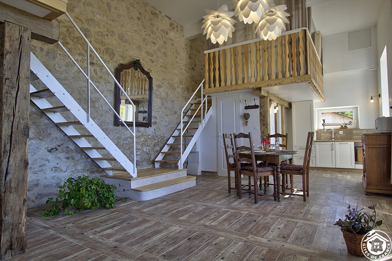 Through a separate entrance, this bright loft blends the charm of wood and stone, its trompe l'oeil flooring and warm, uncluttered decor. The entrance opens onto a fully-equipped kitchen and living room with a sofa bed (regular 160cm bed). A staircase separates to offer 2 mezzanines: a small mezzanine with a 90*190 bed and a mezzanine with a 160 bed. A bathroom with walk-in shower and separate toilet.