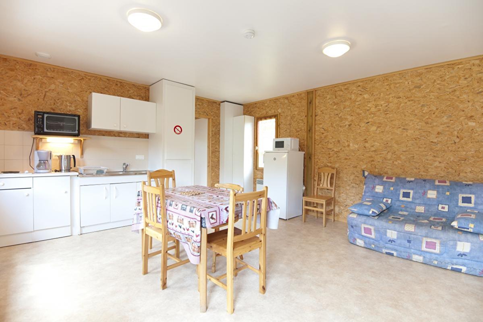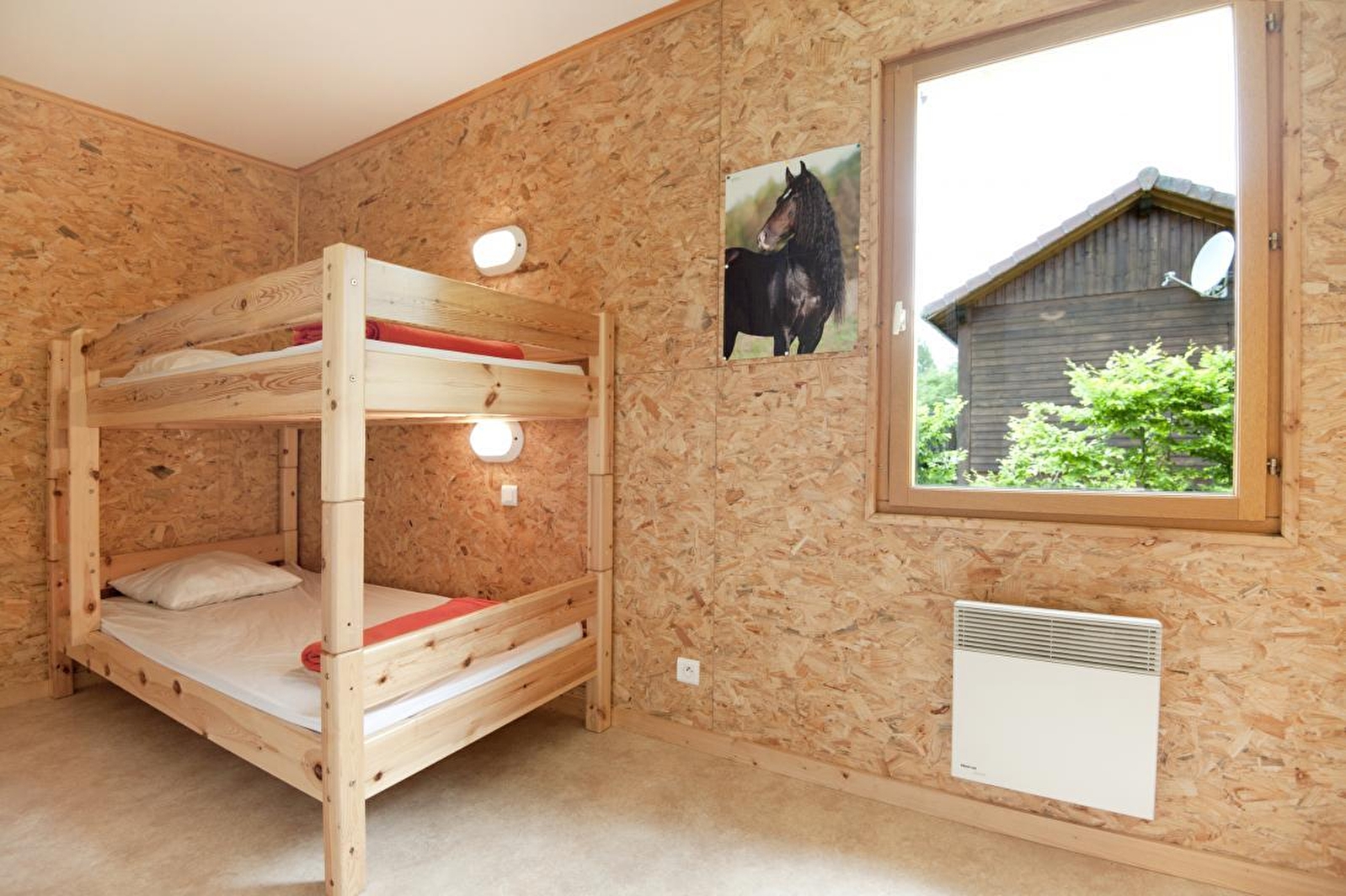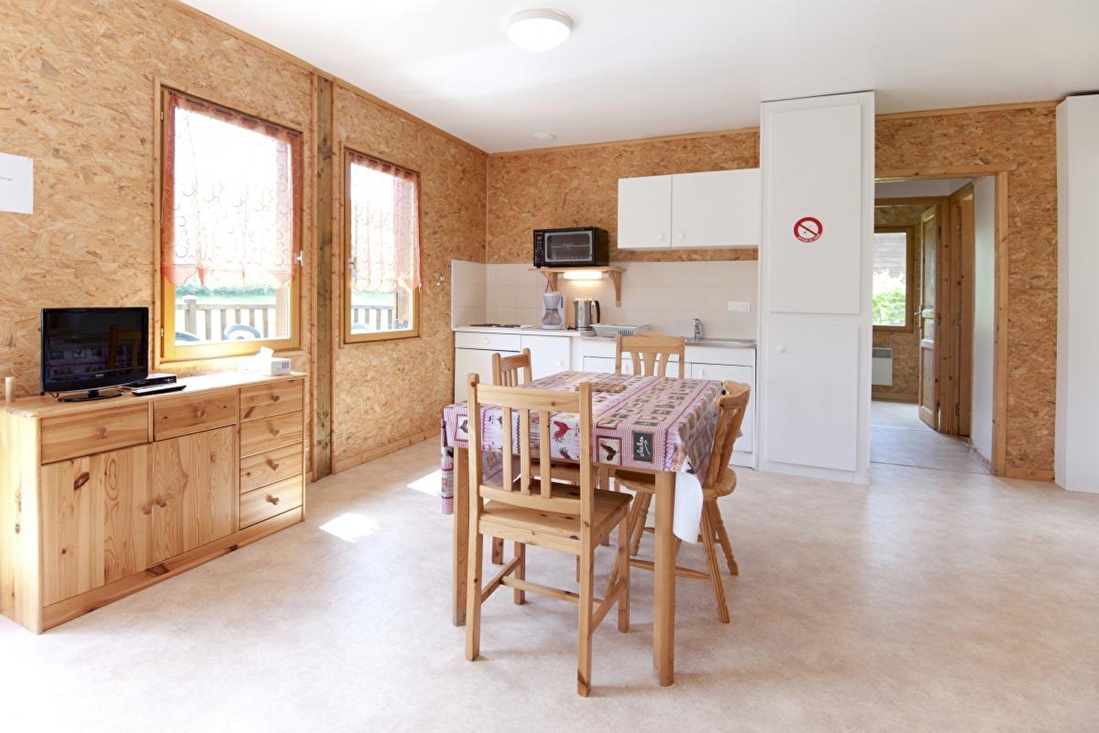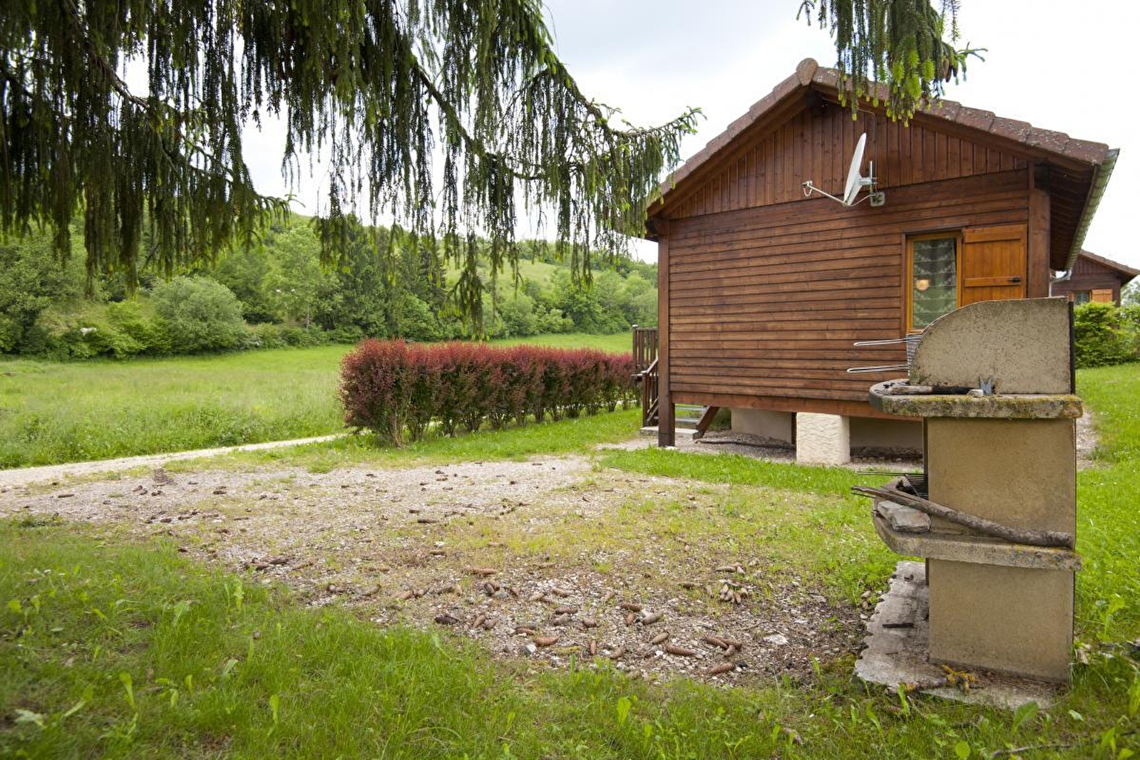 Wooden cottage (50 sq.m.) near village & fishing lake. Access via steps. Large terrace (10 sq.m.). Open plan living room/kitchen area/lounge (double sofa bed, TV point), 2 bedrooms (double bed) (2 single bunks), shower room, WC. Electric heating. Private parking, garden.