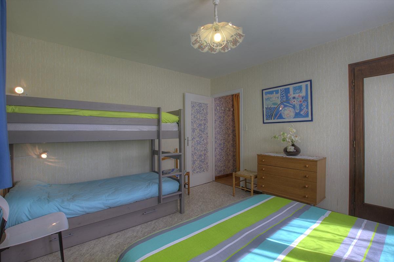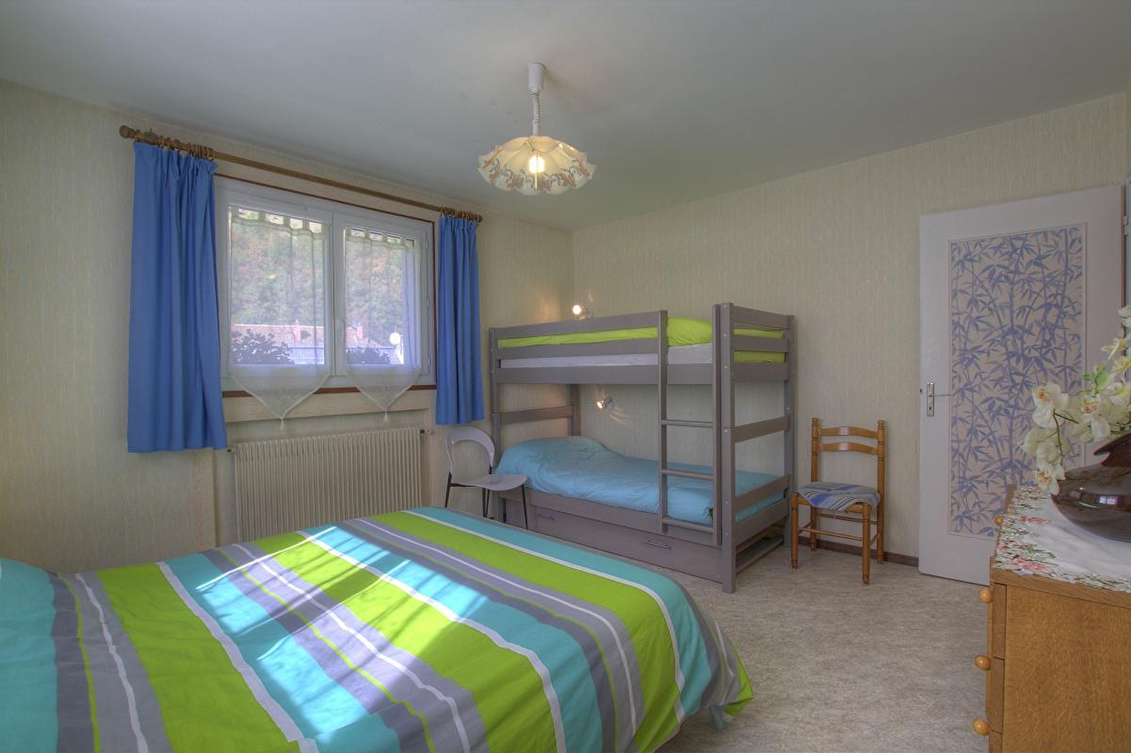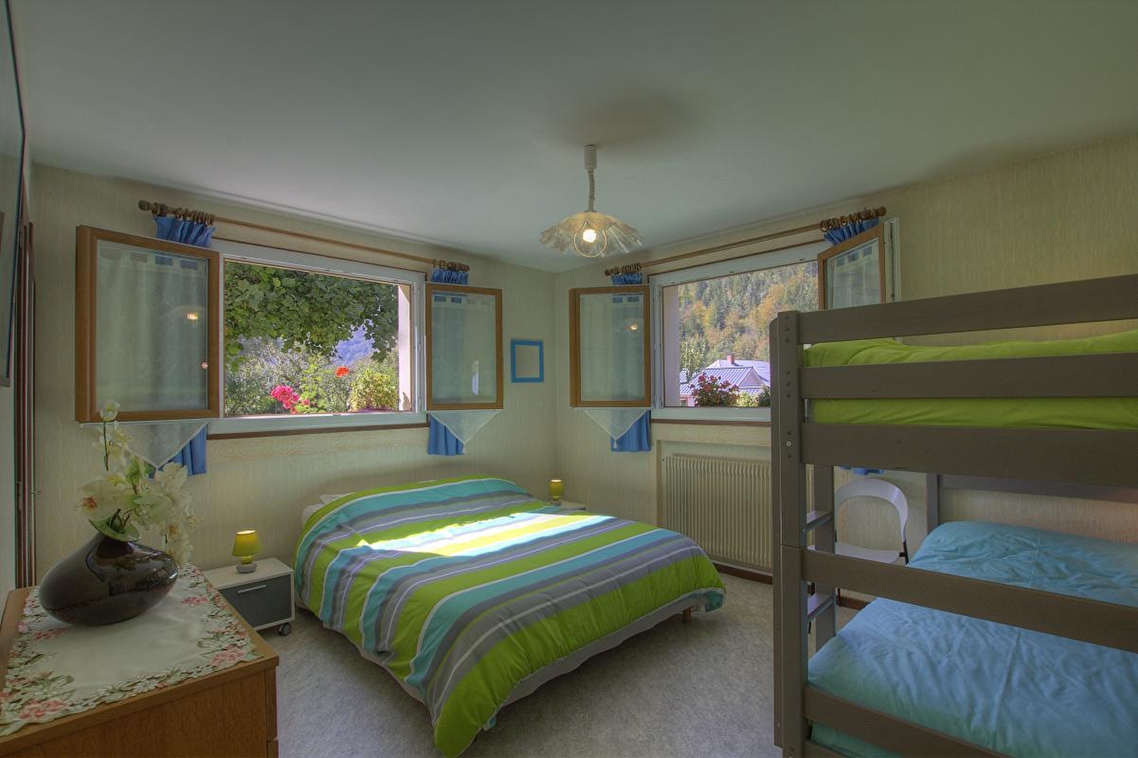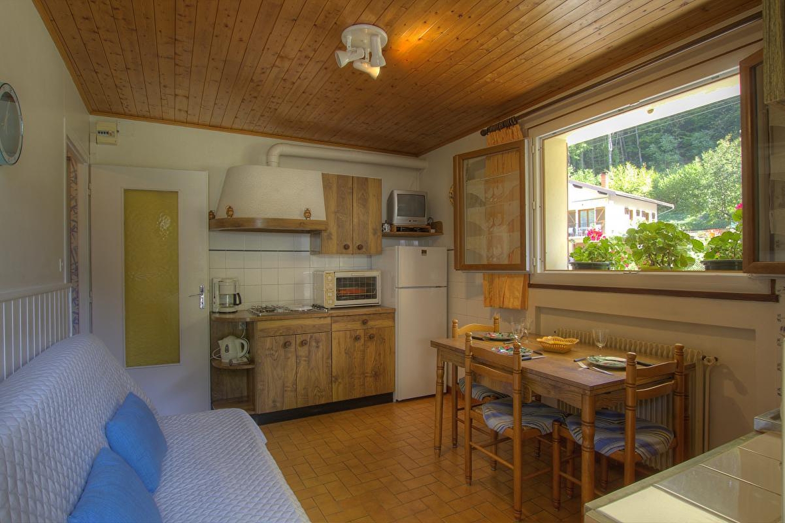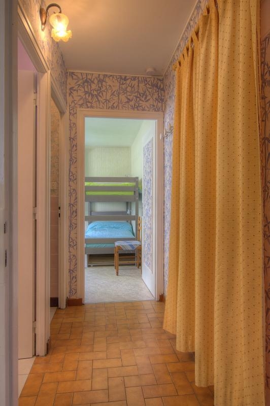 Living room (TV) with fitted kitchen area, bedroom (160x200cm bed, 2 single bunks), shower room. Central heating. Unfenced grounds and wooded garden with terrace. Shops nearby. Fixed price for optional cleaning: 40€.