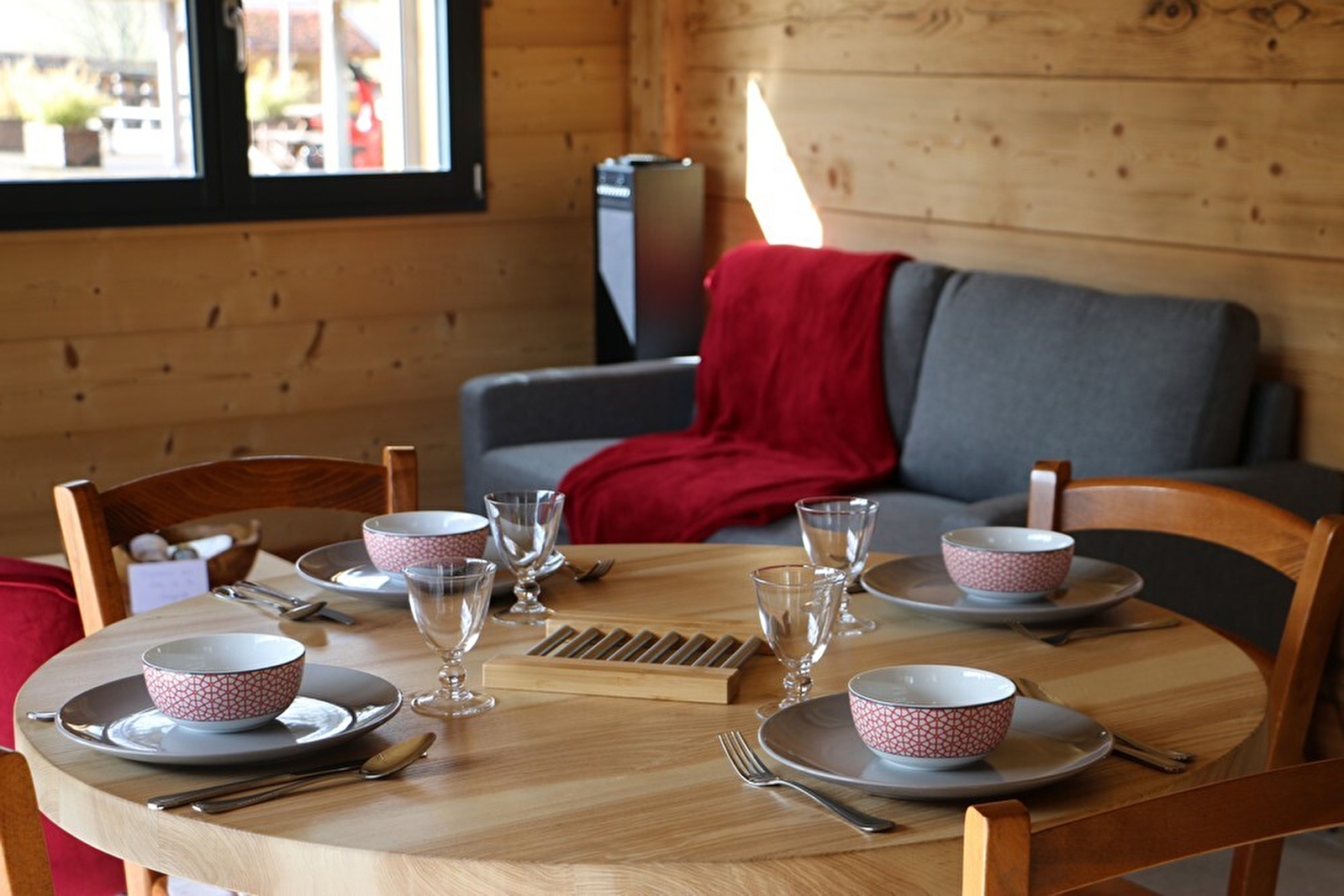 Ideally located in the heart of the Haut Jura Regional Nature Park, between the Lake District and the mountains, to enjoy summer and winter alike, come and discover these pretty brand new chalets, one of which is accessible to people with reduced mobility. The first chalet sleeps 4 and comprises a lovely living room with a fully-equipped kitchen area and a sitting room with sofa, flat-screen TV and Bluetooth hi-fi system. A master bedroom with a 160x200cm bed and a small bedroom (6m²) with 2 bunk beds. Shower room (walk-in shower), separate wc. For the more adventurous, a second relaxation area on the mezzanine is accessible via the ladder, where a BZ sofa is installed. Terrace with garden furniture, barbecue and deckchairs. The second chalet sleeps 6 and comprises a lovely living room with a fully-equipped kitchen, a reading area and a dining area. The first bedroom has a 160x200cm bed. Bathroom with large walk-in shower and double washbasin. Separate WC. Upstairs, mezzanine lounge with sofa, armchairs and flat-screen TV. A second bedroom with 3 single beds (90cm) and a third bedroom with a double bed (160cm x 200cm). There is a lovely terrace with garden furniture and barbecue. There is a large adjoining garden with a children's play area and, in summer, you can use the owners' semi-underground heated swimming pool (diameter 7.5m - depth 1m20). For added comfort, bed linen and towels are provided. Don't wait any longer to book!