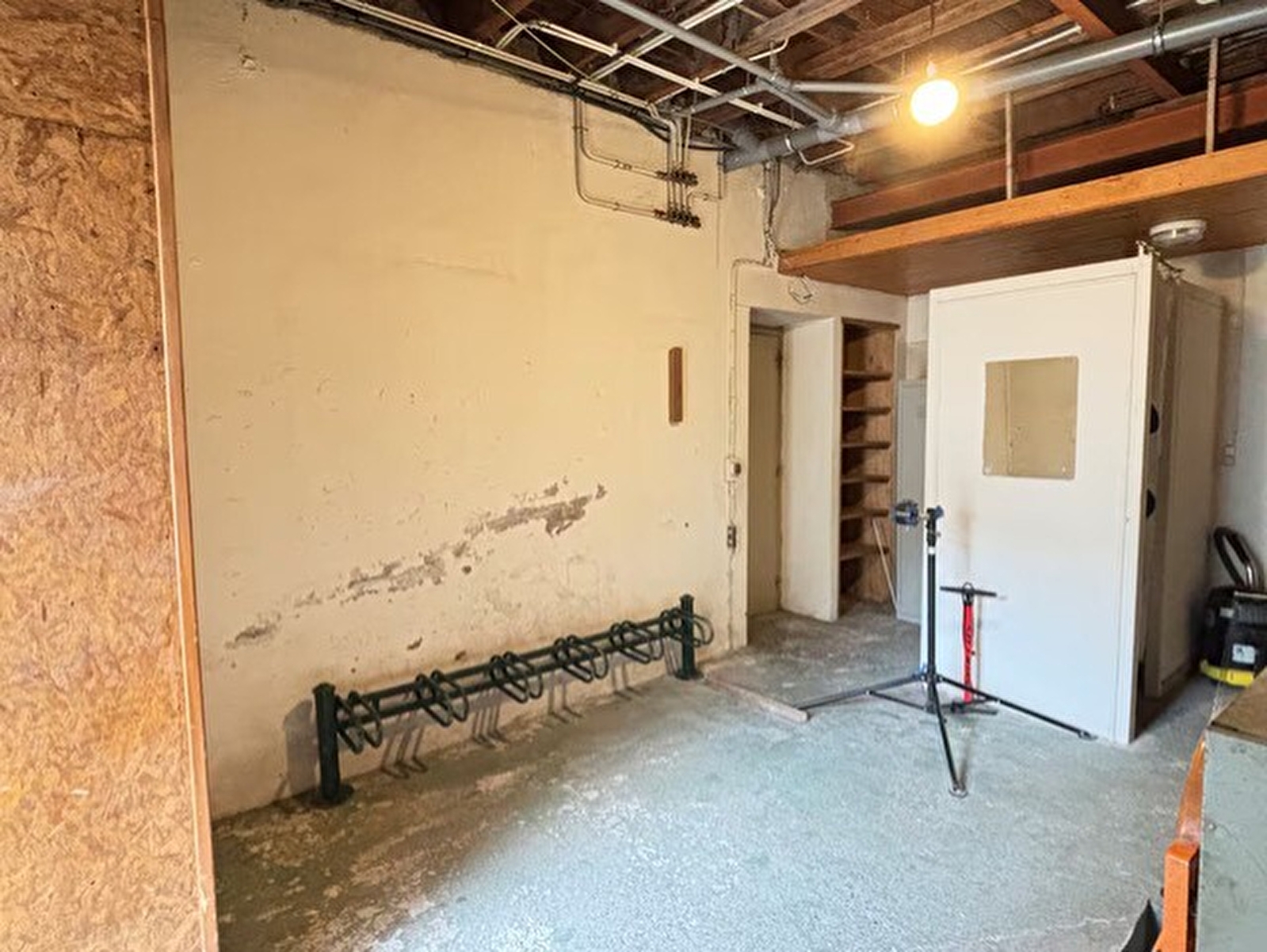 Secure bike storage with repair equipment and lockable lockers.