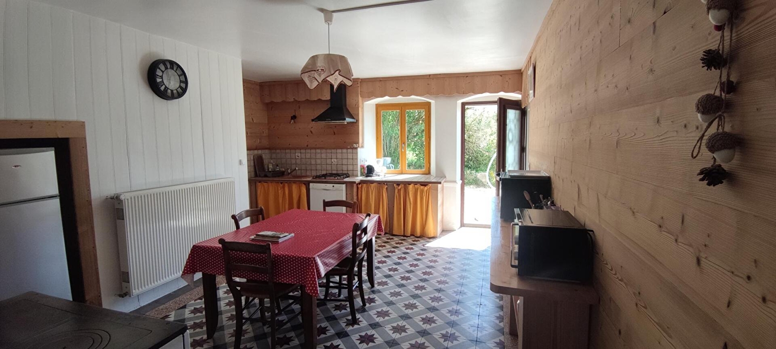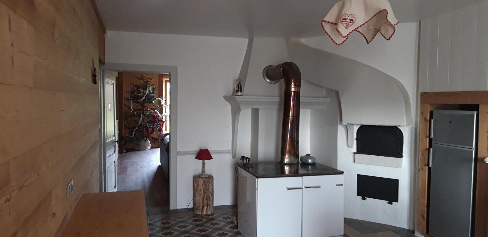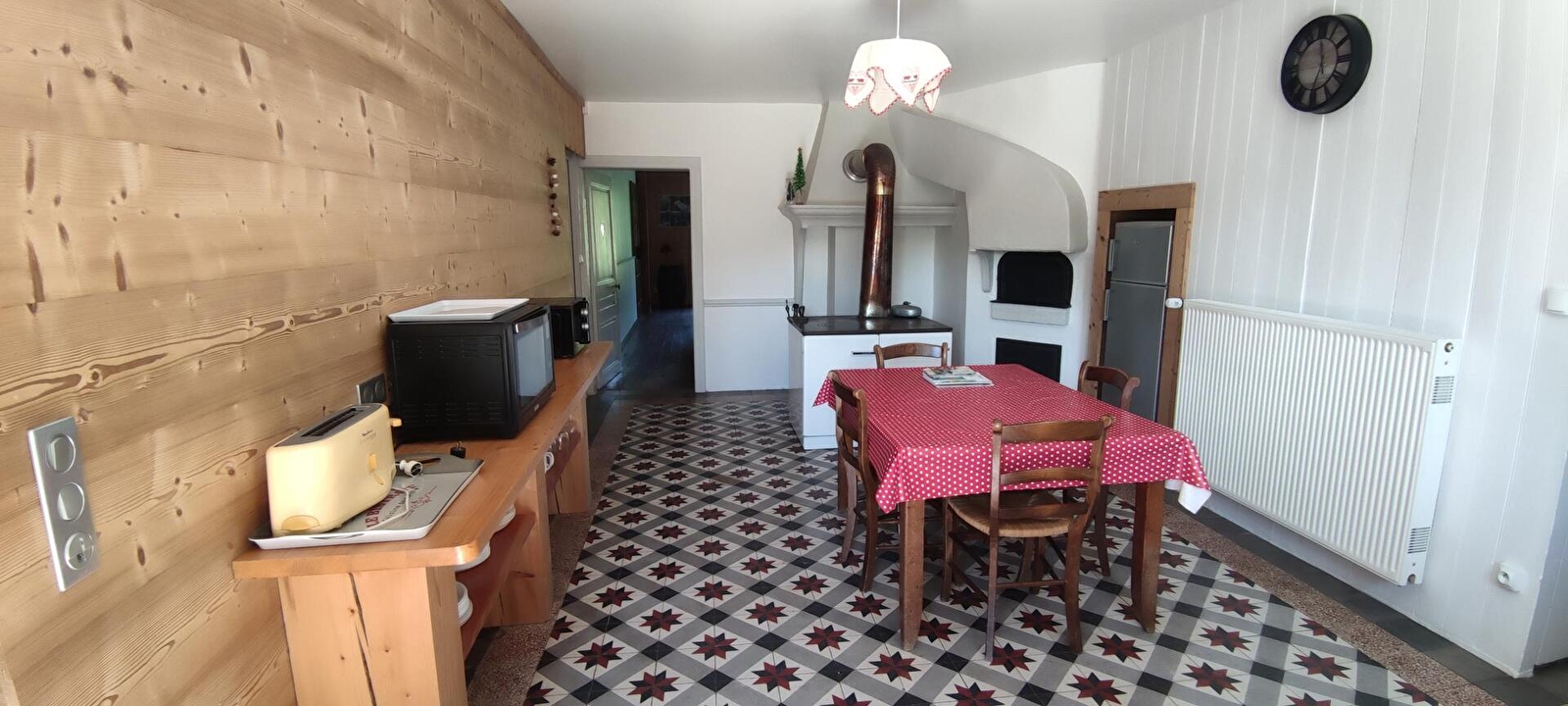 Large kitchen of 20 m² with wood stove, hob, dishwasher, microwave, mini-oven