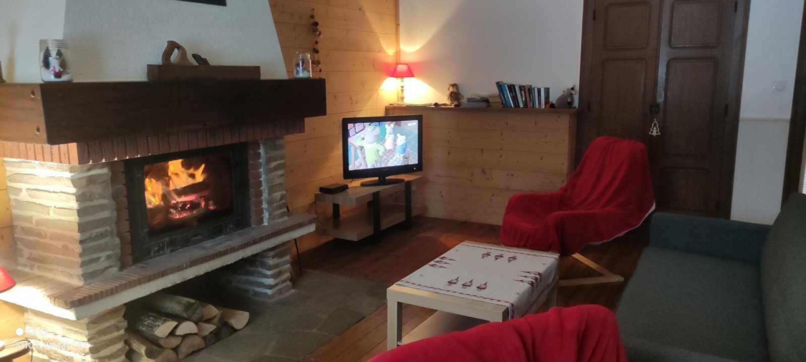 Living room of 30 m² with fireplace and television, wifi.