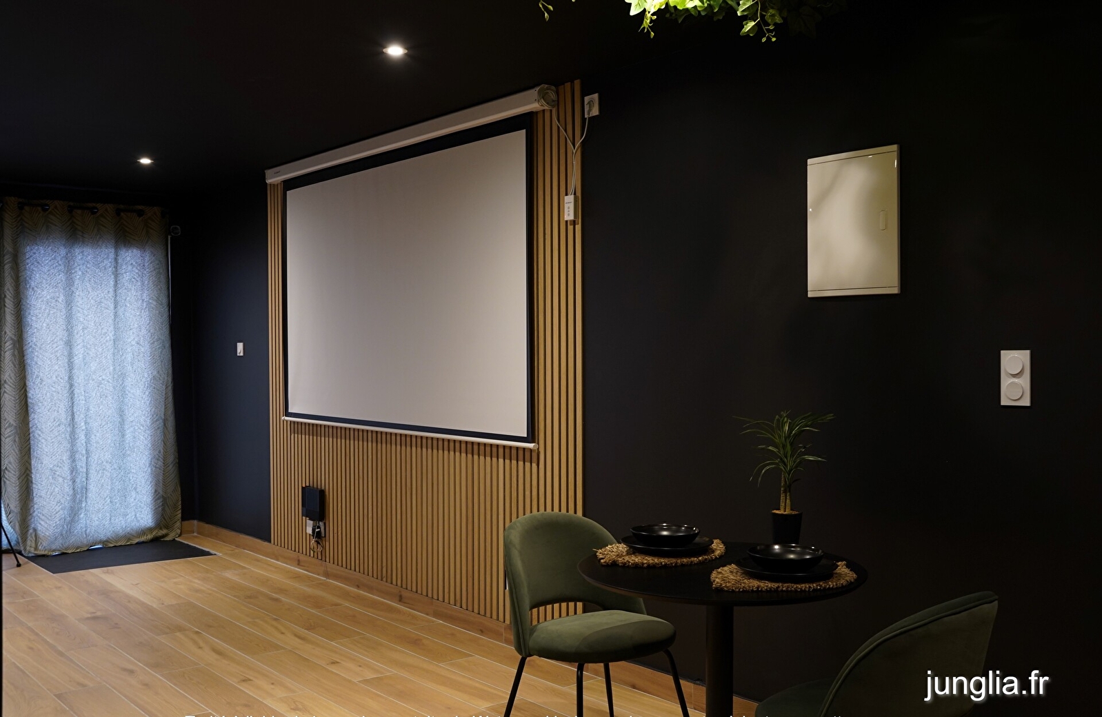 Discover Junglia, an escape in the heart of Bourg-en-Bresse, where jungle atmosphere meets high-end refinement. Our apartment offers a unique experience. Plunge into a private Jacuzzi, enjoy a large cinema screen with video projector and relax under a chromotherapy shower. Junglia's chic style makes it the ideal place for an unforgettable evening as a couple. Book now and let yourself be swept away by Junglia's tropical atmosphere.